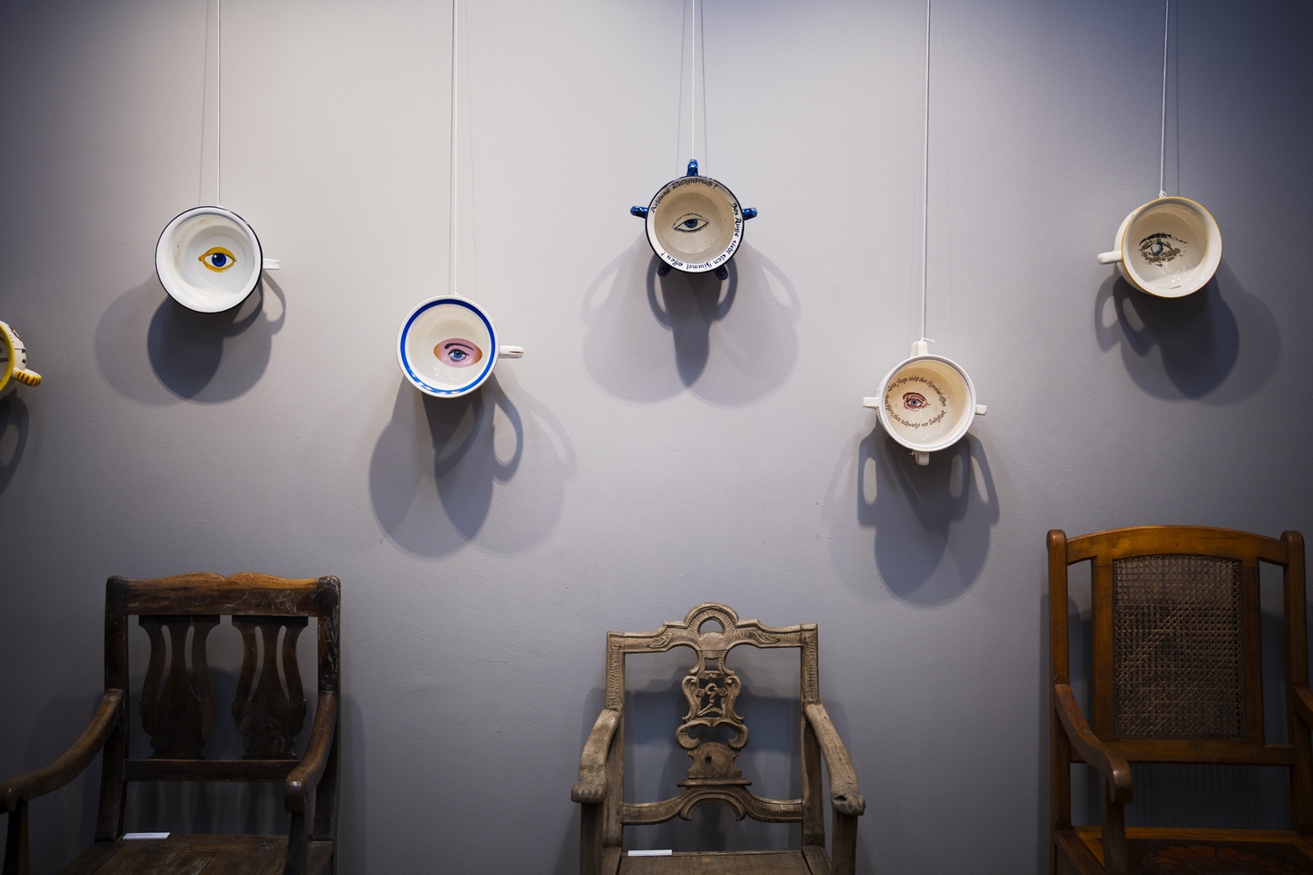 Tuż przy wejściu na wystawę „Tam gdzie król chodzi piechotą” zaskakują nas na ścianie nocniki z wyraźnie namalowanym na dnie okiem, które wygląda niemal jak symbol opatrzności. Wytłumaczenie obecności oka w naczyniach jest prostsze.