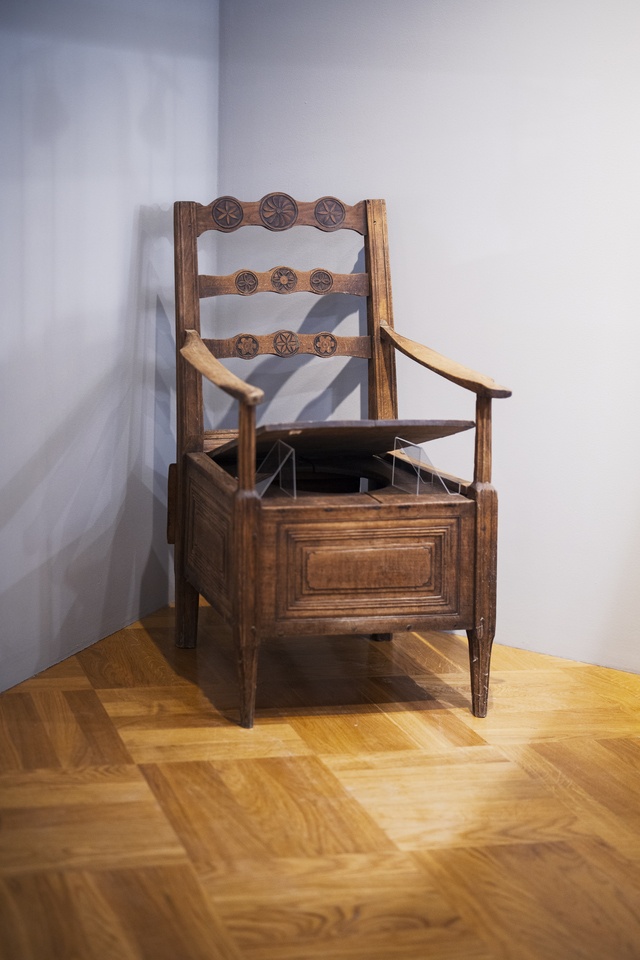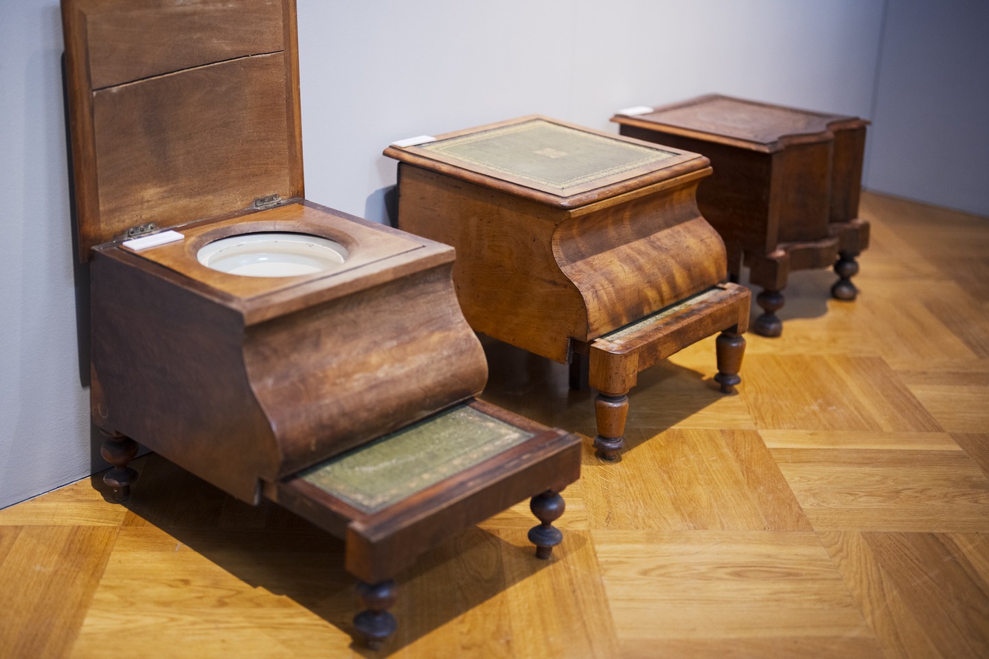 Problem toaletowy jest stary jak świat, a najstarszym eksponatem na wystawie jest fotel toaletowy z XVIII wieku z wyciętym w siedzeniu otworem i pokrywą zamykającą.