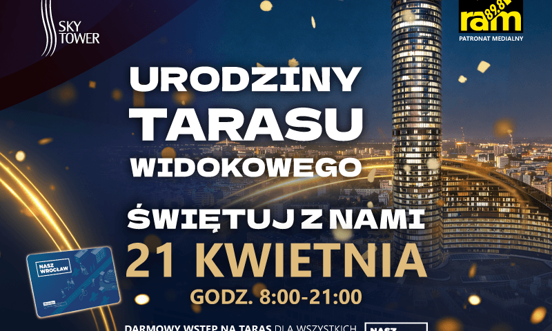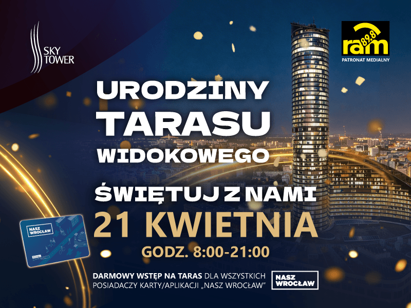 21 kwietnia każdy posiadacz Nasz Wrocław (karta albo aplikacja z aktywnym Statusem Podatnika) wejdzie na taras bezpłatnie. To dobry moment, żeby wyrwać się z codziennego rytmu i spojrzeć na swoje miasto z zupełnie innej perspektywy - z wysokości 49. piętra, skąd Wrocław wygląda jak żywa makieta. Ale jego urodziny to święto przede wszystkim dla samych Wrocławian - dla tych, którzy byli na nim już wiele razy i za każdym razem zauważają coś nowego, i dla tych, którzy wciąż nie mieli okazji go zobaczyć.