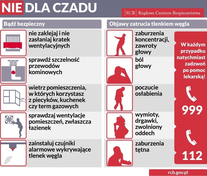 Jeżeli masz w domu piecyk, kominek czy termę gazową, bezwzględnie upewnij się, że urządzenie działa właściwie, a kanały kominowe i wentylacyjne są drożne. Najlepiej poproś fachowców – kominiarzy lub gazowników – o przeprowadzienie kontroli. Zastanów się, czy nie warto dla bezpieczeństwa domowników zainstalować w zamkniętych pomieszczeniach, zagrożonych emisją czadu, gazu ziemnego lub propanu-butanu, czujników wykrywających te trujące gazy. My twierdzimy, że bezwzględnie warto. Takie urządzenia są stosunkowo tanie, montując je, nie zwiększysz kosztów eksploatacji, za to zyskasz skuteczne ostrzeżenie i zabezpieczenie przed zatruciem. A pomyślałeś może o wymianie pieca kaflowego, w którym zdarzyło ci się palić nie tylko węglem, na ogrzewanie w ramach programu Kawka?