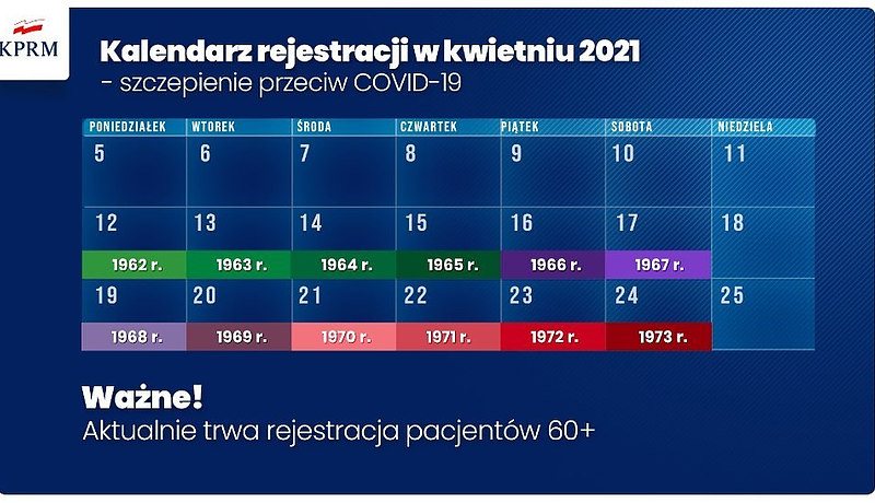 Michał Dworczyk poinformował także, że 12 kwietnia ruszą zapisy za szczepienia osób urodzonych w 1962 r., a potem każdego dnia kolejny rocznik będzie dołączał do zapisów. Docelowo, do 24 kwietnia możliwość zarejestrowania się będą mieli wszyscy chętni urodzeni w 1973 r.