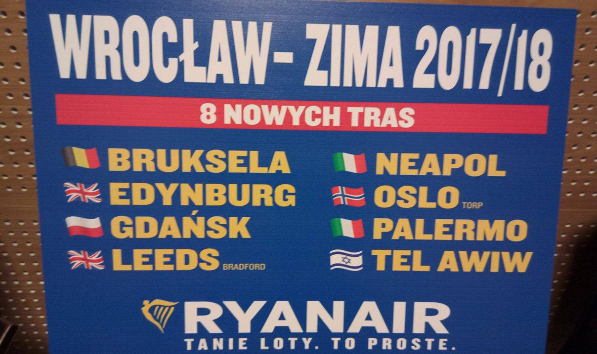 Linie Ryanair ogłosiły osiem nowych kierunków w zimowym rozkładzie lotów 2017/2018. Z Wrocławia polecimy na Sycylię do Palermo (2 razy w tygodniu), Brukseli (3 razy w tygodniu), Edynburga (2 razy w tygodniu), Tel Avivu (2 razy w tygodniu), Oslo (2 razy w tygodniu), Neapolu (2 razy w tygodniu), Gdańska (3 razy w tygodniu) oraz Leeds Bradford (2 razy w tygodniu).