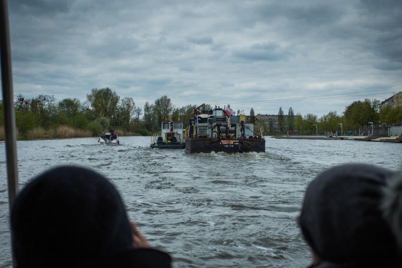 Jedyną możliwą formą transportu ogromnych 45 fragmentów, jakie utworzą rzeźbę (długości 15 metrów i wysokości 7,5 metra w najwyższym miejscu) okazała się droga rzeczna. – Elementy „Nawy” przekraczają wszelkie normy transportu kołowego, więc są spławiane z portu barkami, jak działo się to, gdy Odra była rzeką rejsową, żyła i zapewniała ludziom pracę – przypomina Oskar Zięta. Części rzeźby płynęły w kierunku Wyspy Daliowej na barce kierowanej przez pchacz „Tur” pod kolejnymi mostami – Grunwaldzkim i Pokoju, a przed Mostem Piaskowym „Tura” zmienił mniejszy i niższy „Żwirek”. – Jeden transport trwa od 4 godzin do nawet jednego dnia, zależy od przepustowości śluz – mówi Oskar Zięta.