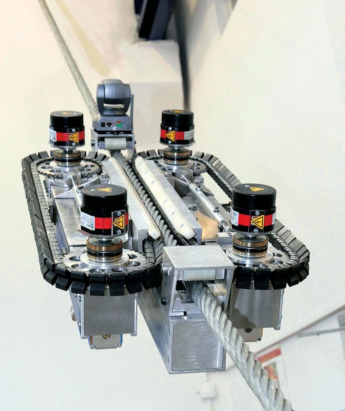 „Linołazem” albo „gąsienicą” nazywają potocznie swój wynalazek inżynierowie z Politechniki Wrocławskiej – prof. Piotr Dudziński i mgr inż. Adam Konieczny z Wydziału Mechanicznego. Jego fachowa nazwa zaś to: mechatroniczny pojazd gąsienicowy. Przeznaczony jest do serwisowania lin, zabezpieczających wysokie obiekty, takie jak stalowe komy, mosty czy maszty antenowe, do których dotarcie na całej ich długości bywało czasami wręcz niemożliwe. Ze względu na brak urządzenia, które dałoby radę wspiąć się po wysmarowanej towotem powierzchni. Prace nad „linołazem” trwały dwa lata. Powstała (2012 r.) 80-kilogramowa maszyna z napędem na cztery koła, która jako pierwsza na świecie może poruszać się po mocno nachylonych (co najmniej pod kątem 65 st.) linach pokrytych smarem. Bez obawy o uszkodzenia, może ona również samoczynnie pokonywać napotkane przeszkody – złącza linowe, wsporniki czy izolatory, a każdy ruch urządzenia jest nagrywany kamerką, podgląd zaś od razu trafia do komputerów. Dzięki temu obsługujący „gasienicę” może na bieżąco śledzić każdy fragment badanej liny. (fot. „Linołaz”, Politechnika Wrocławska)