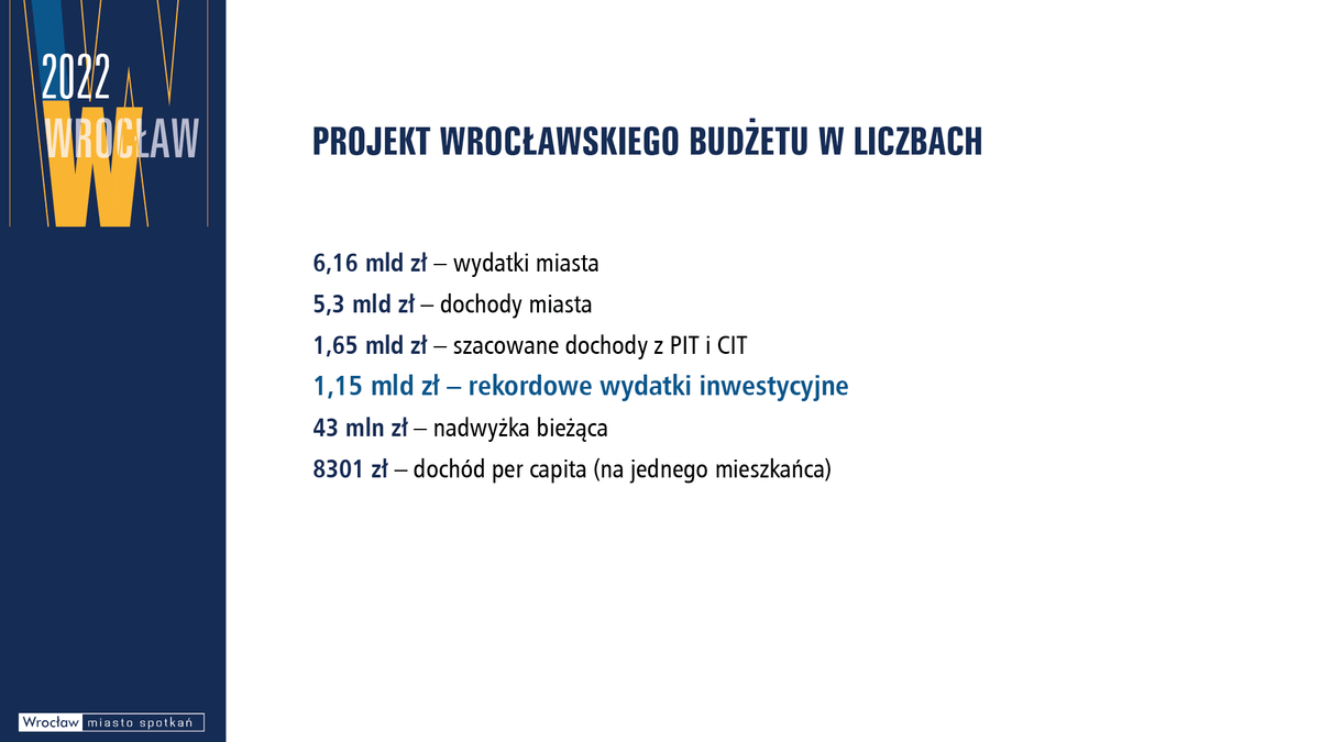 Pomimo niesprzyjających reform podatkowych, mimo pandemii, mimo drożyzny w przyszłym roku planujemy przeznaczyć 1 mld 147 mln zł na wydatki inwestycyjne. To wrocławski rekord. Dla porównania, wg planu na obecny rok, to kwota 1 mld 47 mln zł.