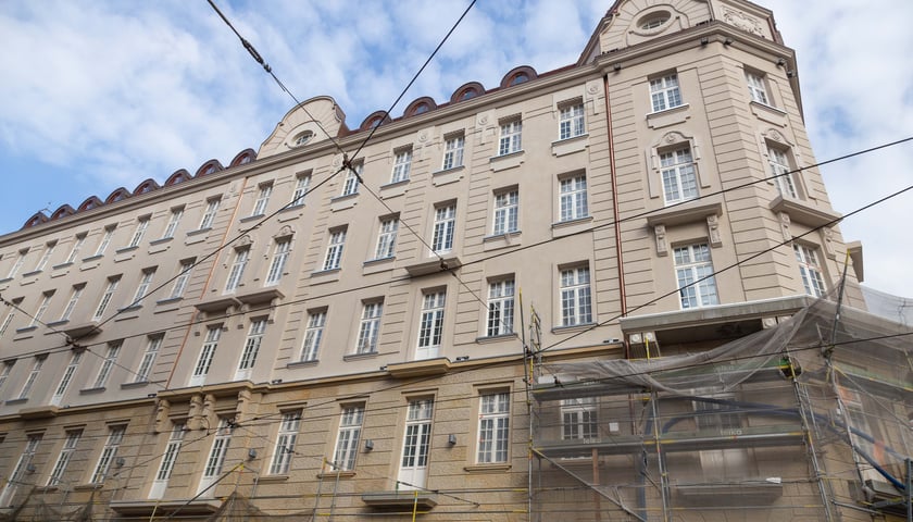 Obecnie prowadzone są kosmetyczne prace przy elewacji prowadzonej tam od kilku lat inwestycji. Prace trwają zwłaszcza na krańcach budynku, gdzie ściany skrywane są jeszcze pod rusztowaniem. Spod zasłon prześwitują kolejne dekoracyjne detale, które również zostały odnowione.