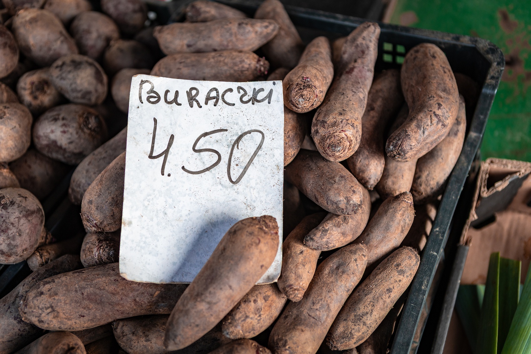 Sprzedaż buraków na wrocławskich targowiskach. Bartosz Mokrzycki