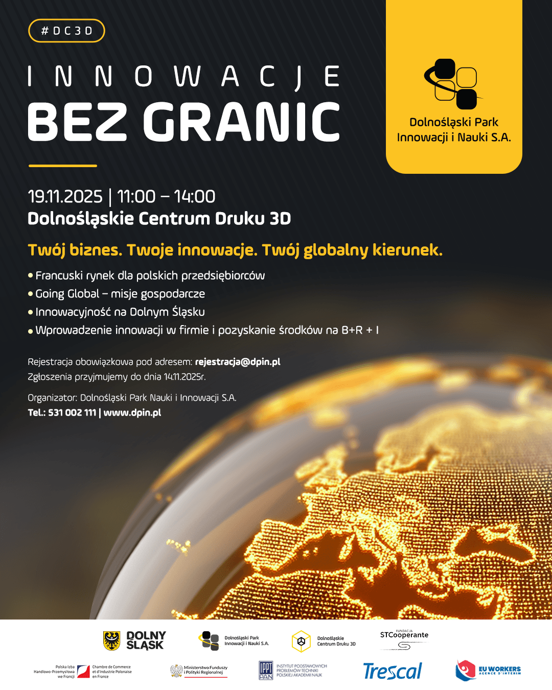 Dolnośląski Park Nauki i Innowacji S.A. zaprasza do udziału w wydarzeniu „Innowacje bez granic”, które odbędzie się 19 listopada 2025 r. w Dolnośląskim Centrum Druku 3D przy ul. Tynieckiej 2 we Wrocławiu.