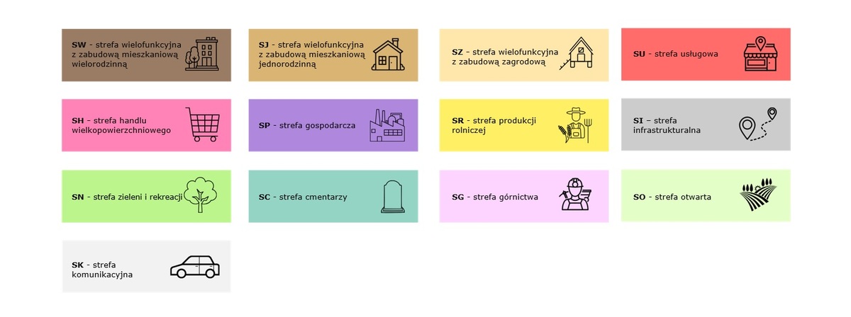 Ustawa określiła zamknięty katalog trzynastu stref planistycznych, a w nich te przeznaczenia, które uznaje się za podstawowe oraz te, które definiując strefę dla danego obszaru można przypisać dodatkowo. Zobacz, jakie to strefy: