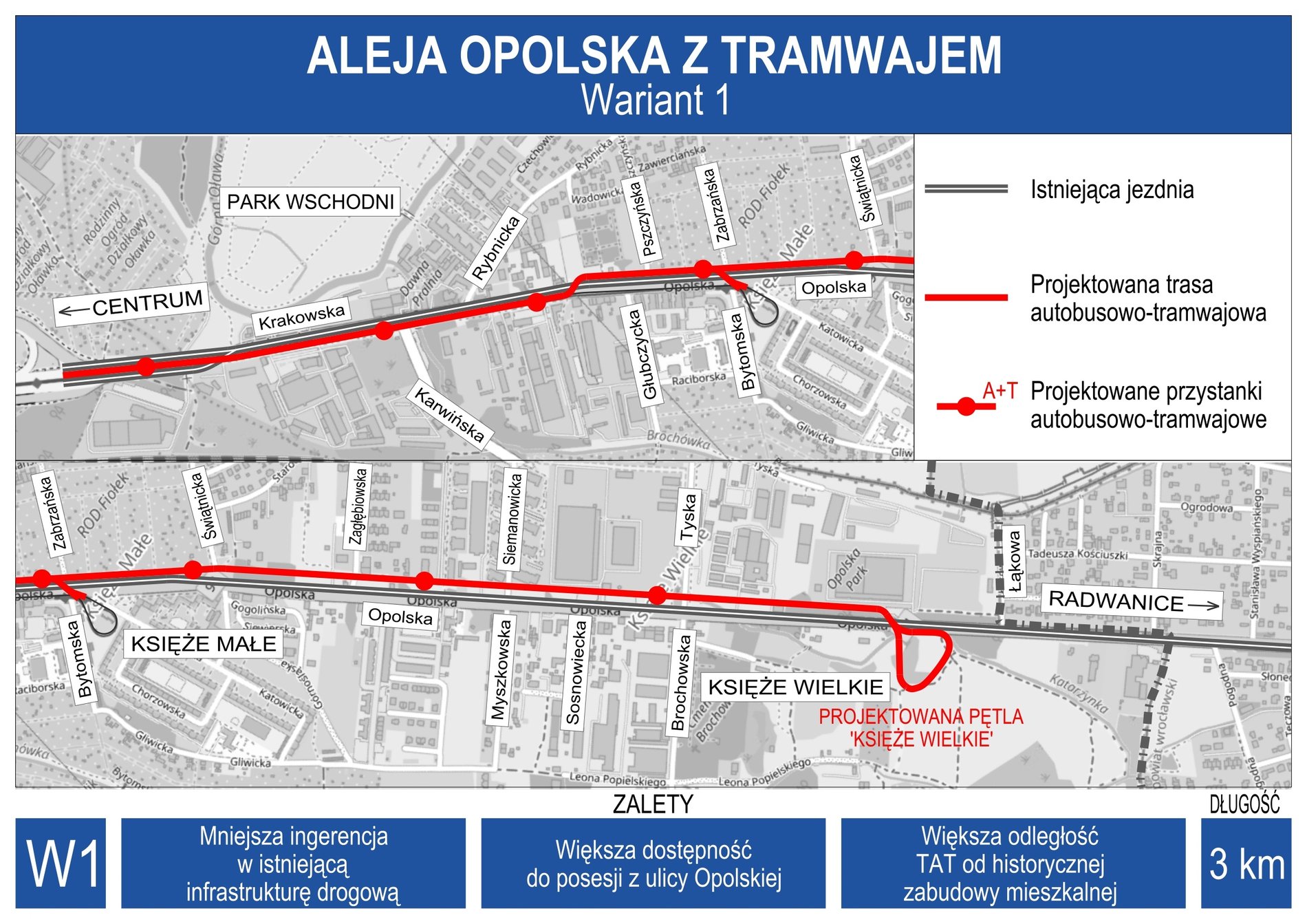 Wariant 1: Dobudowanie trasy tramwajowo-autobusowej w ul. Opolskiej, po jej północnej stronie, od istniejącej pętli do granic miasta, z zachowaniem jezdni w obecnym miejscu oraz budową brakującej infrastruktury pieszo-rowerowej i zasadzenie zieleni.