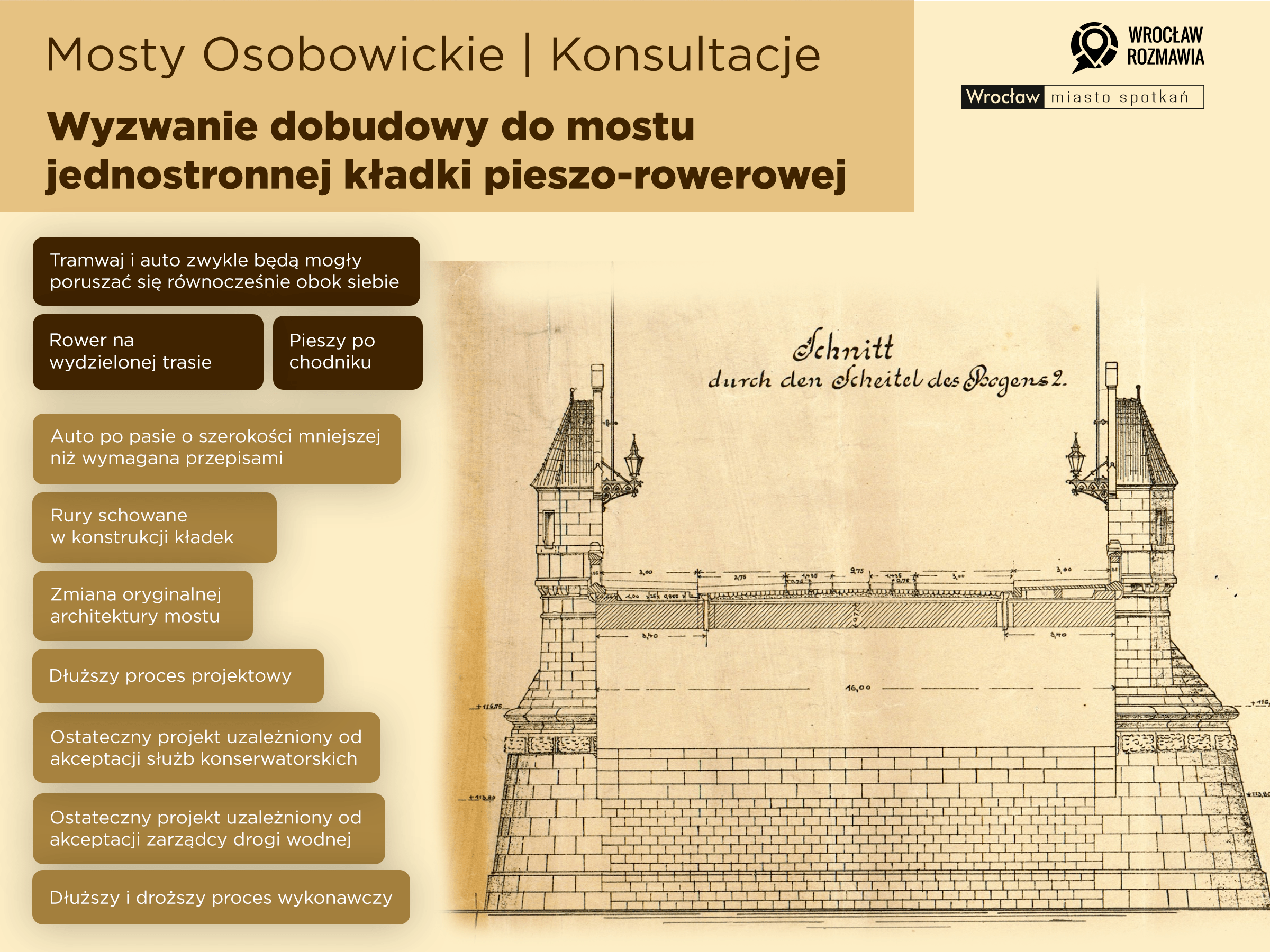 - Nastąpiłoby częściowe i pełne zasłonięcie elementów konstrukcji i wystroju elewacji obiektów, które decydują o wartości zabytkowej Mostów (to m.in.: ozdobne elewacje z cegły klinkierowej ze skomponowanym układem i wzorem, tektonika elewacji, światłocień, a także kolor, decydujące o plastyce obiektu); konieczne byłoby też pełne zasłonięcie przyczółka północnego mostu Osobowickiego Północnego i zmiana wykroju jego granicy w planie.