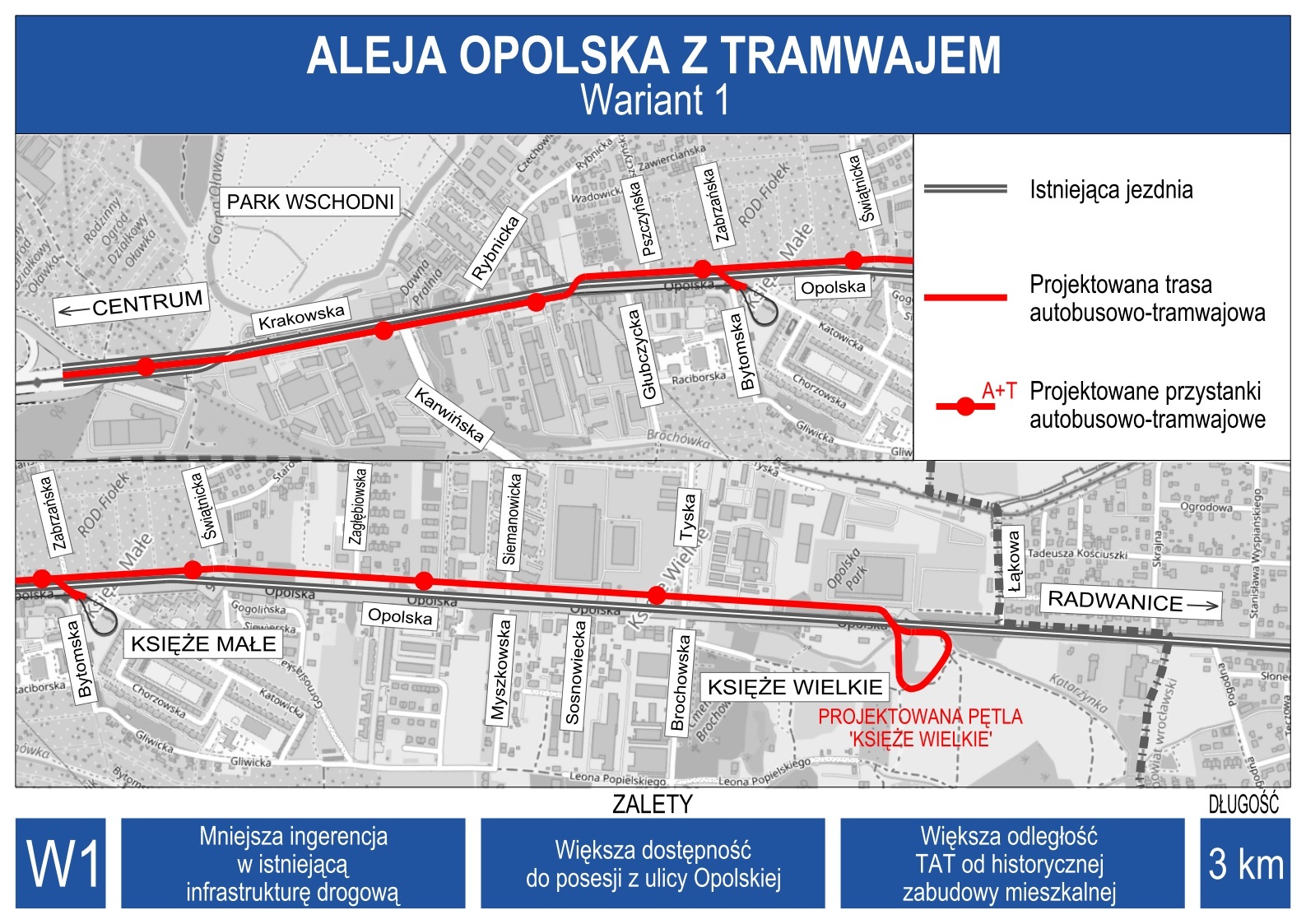 Przebudowana ma zostać cała ulica Opolska oraz fragment Krakowskiej: od AWW do granic miasta. W pobliżu skrzyżowania z ul. Łąkową w Radwanicach, planowany jest węzeł przesiadkowy. Złożą się na niego pętla tramwajowa, pętla autobusowa, przystanki, parking P&R (Parkuj i jedź) i podobny dla rowerów (B&R - parkuj rower i jedź).