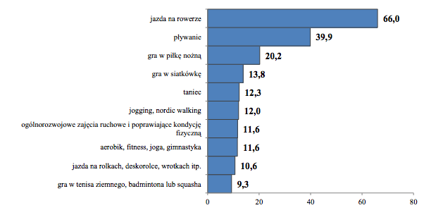 Według badań przeprowadzonych przez Główny Urząd Statystyczny przeciętny Polak najchętniej jeździ na rowerze, pływa i gra w piłkę nożną. Polka zamienia tą ostatnią na aerobik, fitness, yogę lub inne zajęcia gimnastyczne.