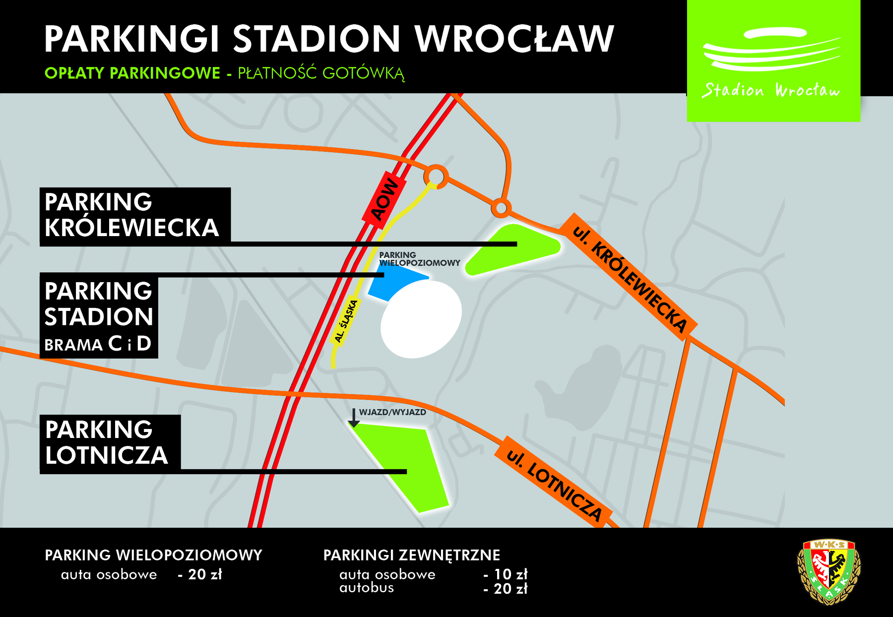 - Parking wielopoziomowy Stadion Wrocław: auto osobowe 20 zł, miejsca dla niepełnosprawnych – bezpłatnie