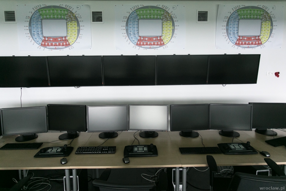 Jedną ze ścian zajmują monitory, na których wyświetlany jest obraz z 400 znajdujących się na stadionie kamer. Operatorzy w każdym momencie mają podgląd na to, co dzieje się na trybunach, parkingach, korytarzach czy esplanadzie. Pracę zaczynają na kilka godzin przed rozpoczęciem każdej imprezy, a kończą w momencie, gdy zamykane są bramy.