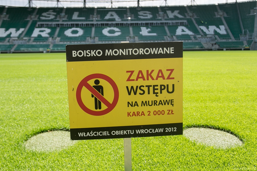 Wychodzimy na murawę, która została kilka tygodni temu wymieniona. Po raz ostatni tego typu operacja odbyła się w maju 2012 r., tuż przed rozpoczęciem piłkarskich mistrzostw Europy. Nowa murawa przyjechała do Wrocławia z Węgier. W sumie położono 9 tys. mkw. trawy, a przy stadionie powstało także poletko zapasowe o powierzchni 400 mkw. To właśnie z niego uzupełniane są ubytki trawy na głównej płycie m.in. po meczach piłkarskich. Koszt wymiany murawy to ok. 500 tys. zł.