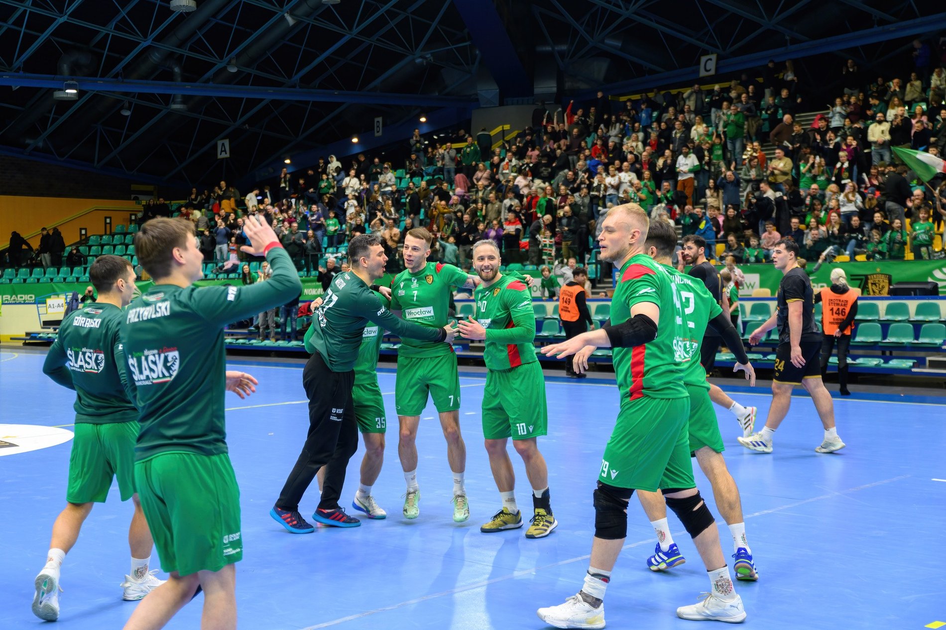 Piłkarze ręczni Śląska Wrocław, na parkiecie hali Orbita, cieszą się po zwycięstwie z drużyną Lotto Puławy