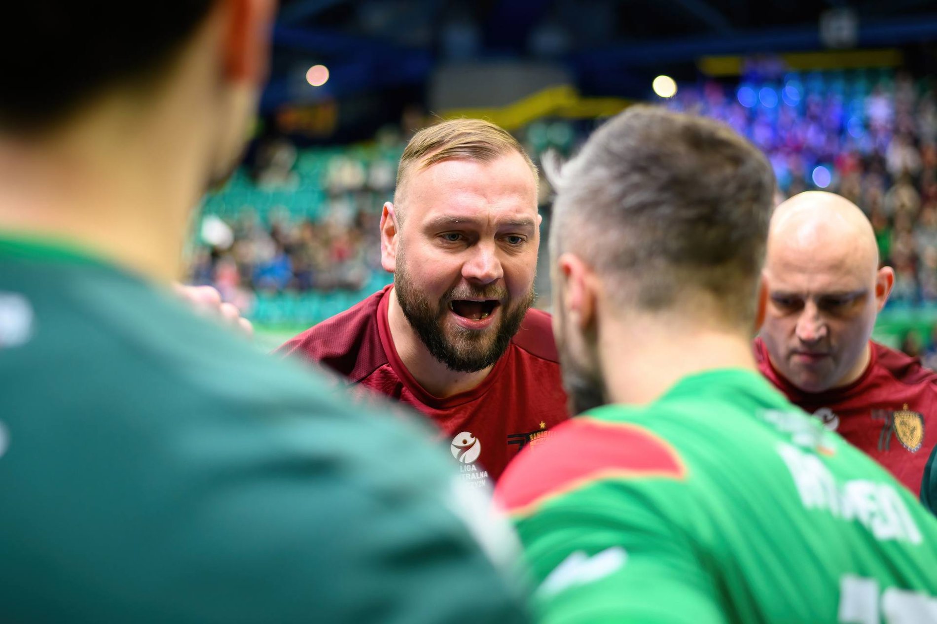 Trener piłkarzy ręcznych Śląska Bartłomiej Koprowski (w środku) przekazuje swoje uwagi zawodnikom podczas meczu w hali Orbita. fot. Przemysław Karolczuk/Śląsk Wrocław