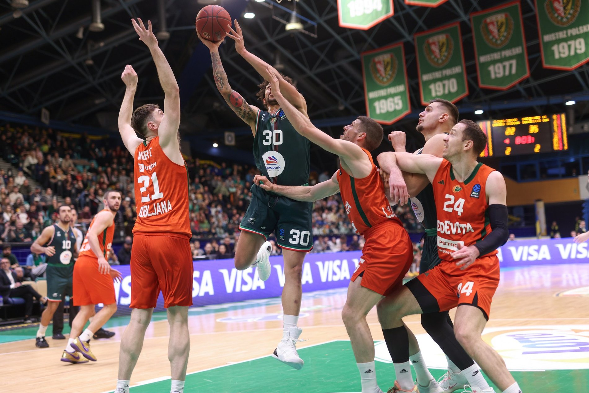 Wśród zawodników z Ljubljany wyróżniali się Umoja Gibson (20 pkt, 9 asyst) i Rok Radović (17 pkt, 3 zbiórki).