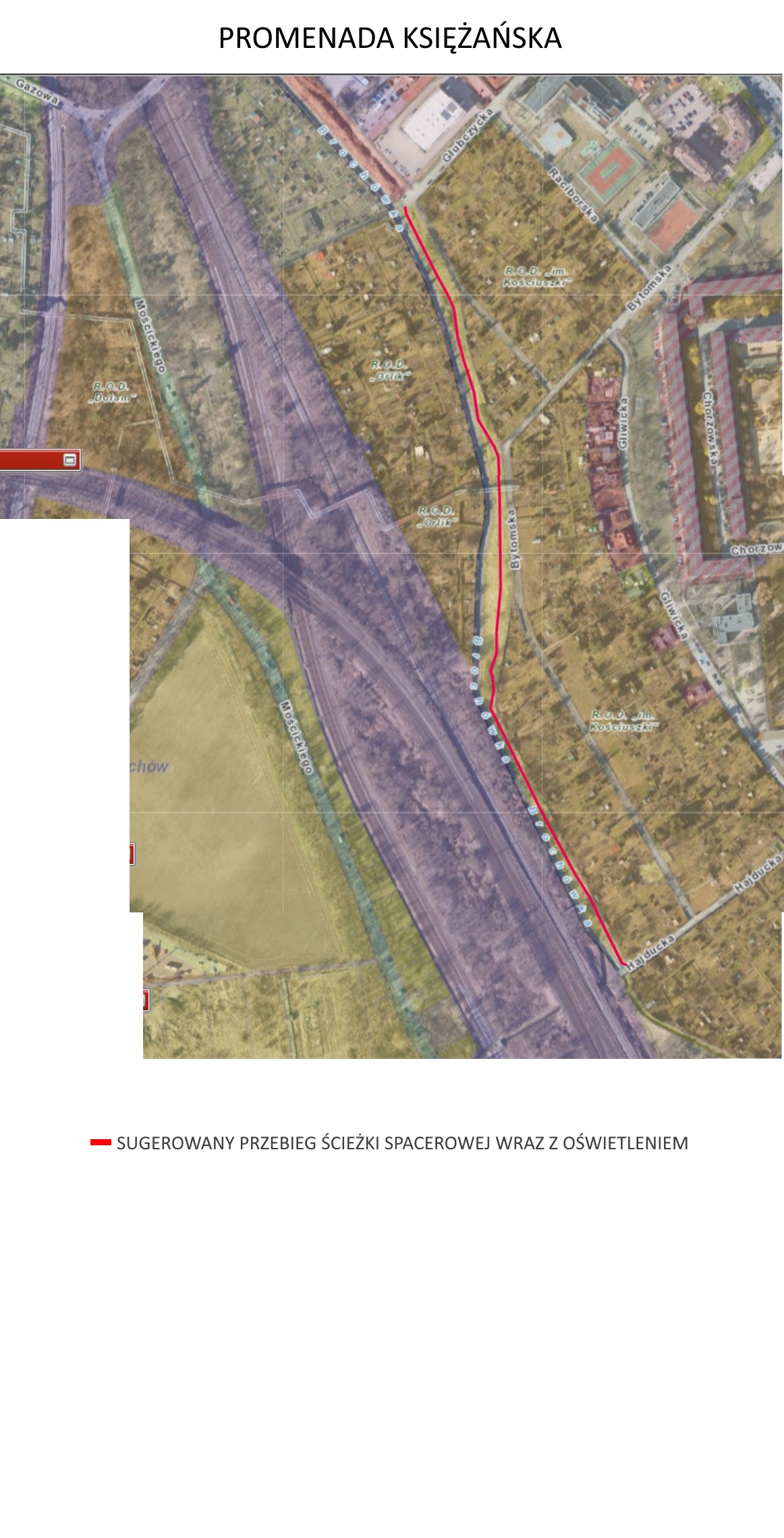1 x 6. KSIĘŻE - PROMENADA KSIĘŻAŃSKA (działki: KSIĘŻE MAŁE, AR_7, 4 oraz KSIĘŻE MAŁE, AR_7, 2) szutrowa ścieżka spacerowa (lub częściowo szutrowe “trasy rowerowe”) biegnąca równolegle do Brochówki od Hajduckiej do Głubczyckiej - 750 m; oświetlenie 750 m ścieżki (25 latarni); kosze na śmieci x2