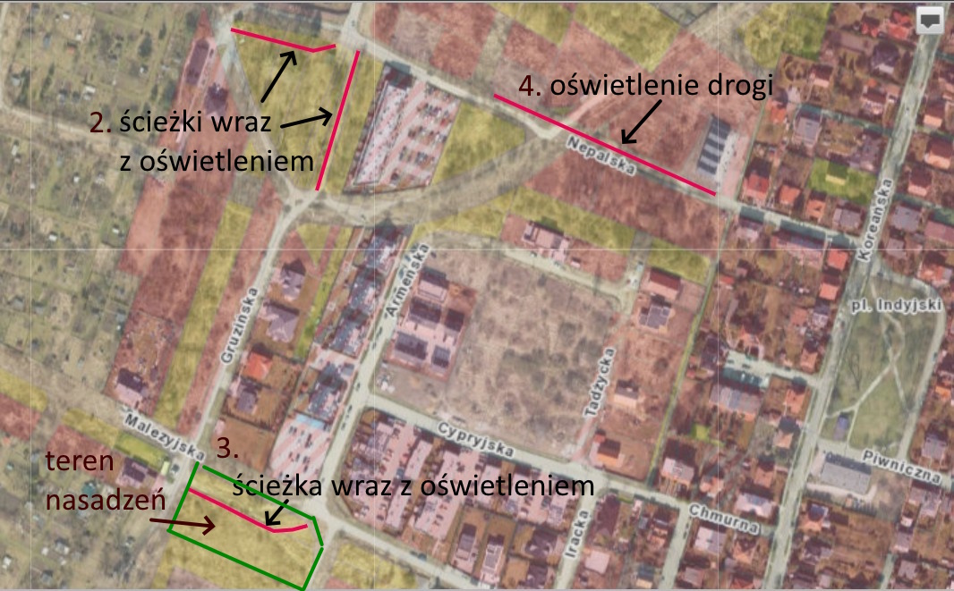 1 x 3. BROCHÓW - PARK NA MALEZYJSKIEJ - etap 1 (działki: BROCHÓW, AR_24, 1/3 oraz BROCHÓW, AR_24, 2/2) - ścieżka spacerowa 100 m; drzewa i krzewy; kosze na śmieci x 2; ławki 2; oświetlenie 4 latarnie