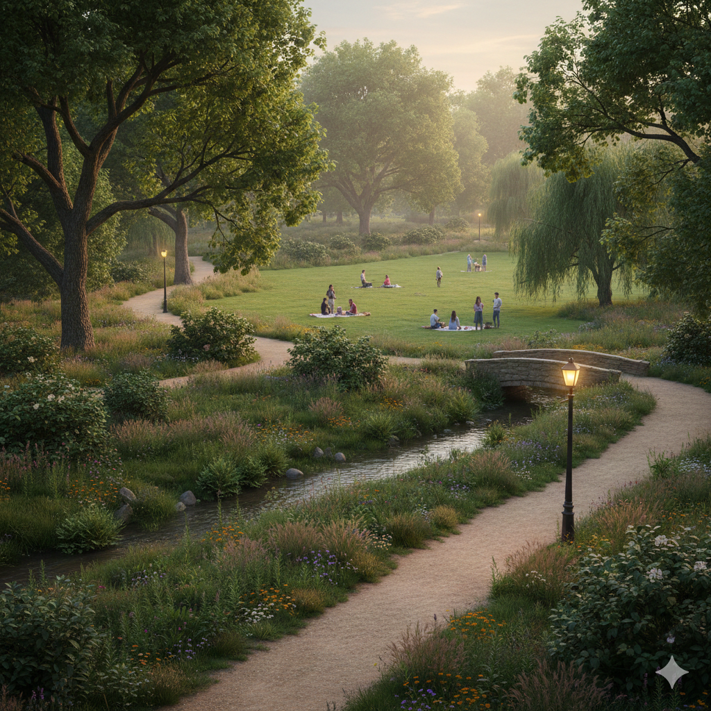 Nowe Żerniki: Klasyczny park spacerowy z wygodnymi alejkami, stylowymi ławkami o kameralnym charakterze. To bezpieczna przestrzeń dla seniorów, rodzin i każdego, kto szuka ciszy wśród zadbanej zieleni i kwiatów.