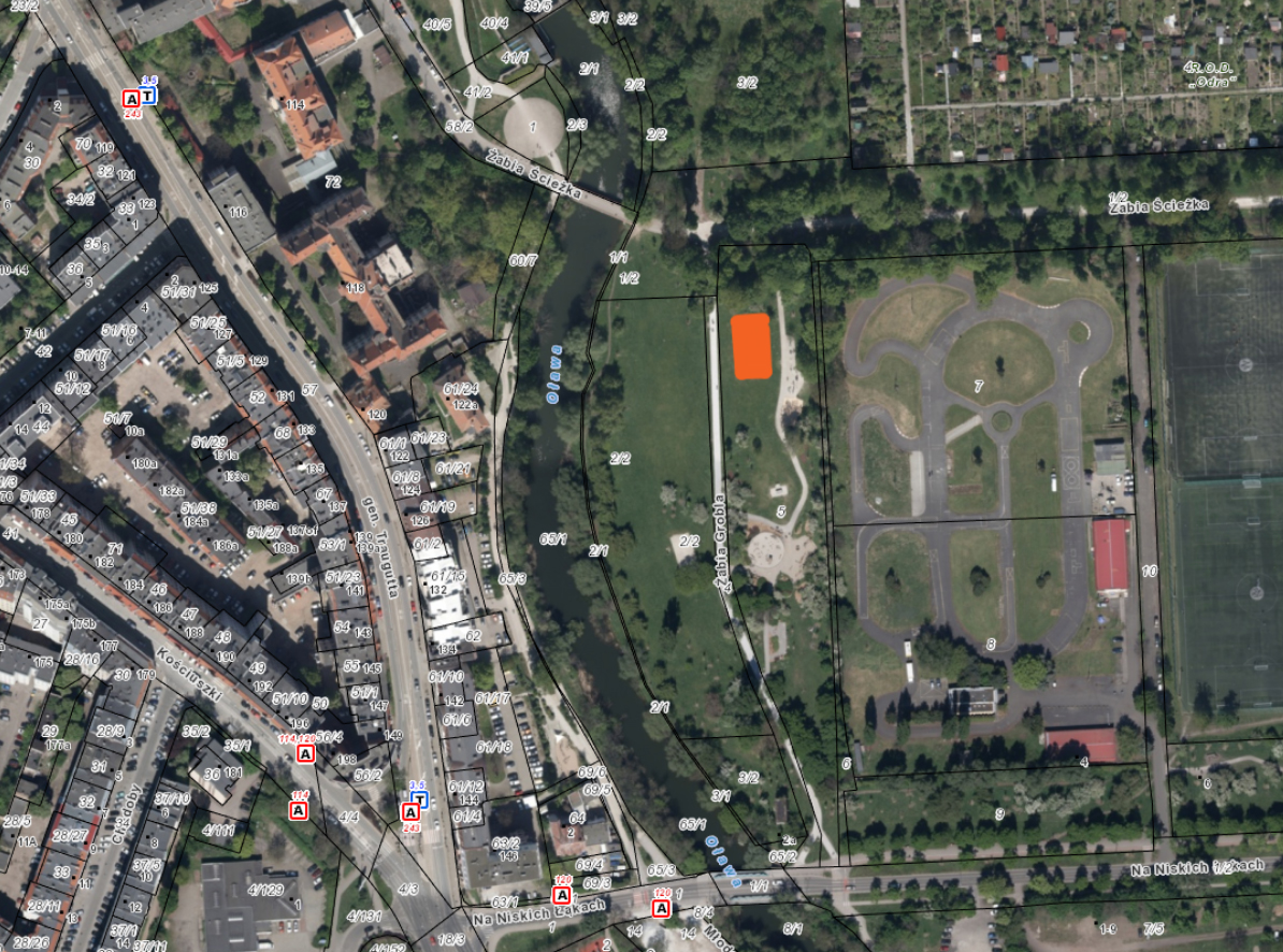 Lokalizacja szczegółowa Przedmieście Oławskie: Park Na Niskich Łąkach, przy Promenadzie Oławskiej, nad rzeką Oławą. Lokalizacja altany pomiędzy ścieżką Żabia Grobla, a częściowo siłownią parkową.