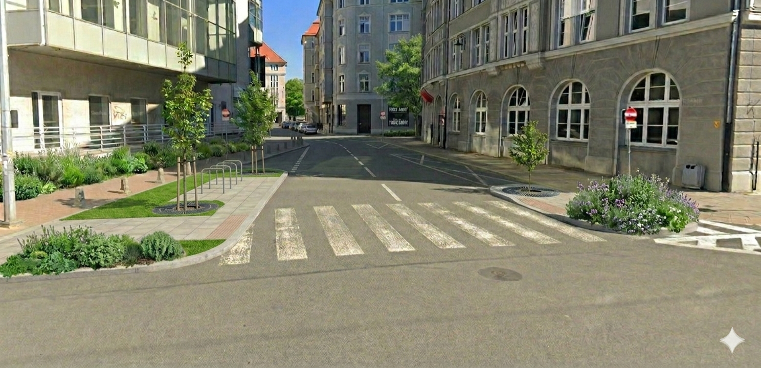 Projekt to bezpośrednia odpowiedź na problem miejskiej wyspy ciepła w ścisłym centrum Wrocławia. Obecnie utwardzona nawierzchnia ul. Zapolskiej wymaga pilnej rewitalizacji, która poprawi mikroklimat i zwiększy retencję wód opadowych. Nasadzenia drzew oraz krzewów rodzimych gatunków stworzą skuteczną barierę antysmogową i akustyczną, znacząco podnosząc jakość życia mieszkańców. Lokalizacja projektu - kluczowy punkt łączący funkcje administracyjne, kulturalne i rekreacyjne - czyni go istotnym dla integracji społecznej. Rewitalizacja tego odcinka trwale podniesie estetykę otoczenia, redukując negatywne skutki zmian klimatu w gęsto zabudowanym śródmieściu.