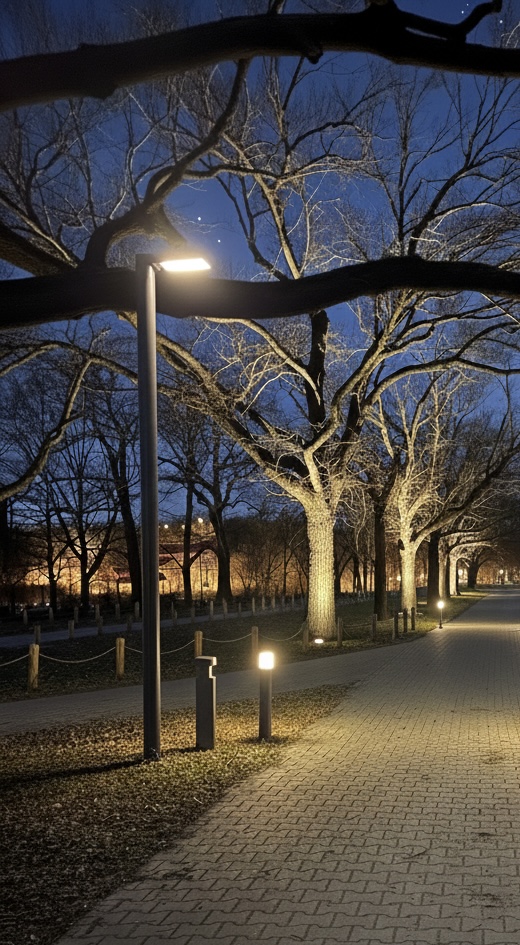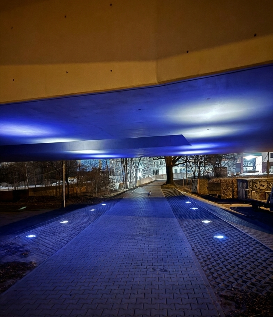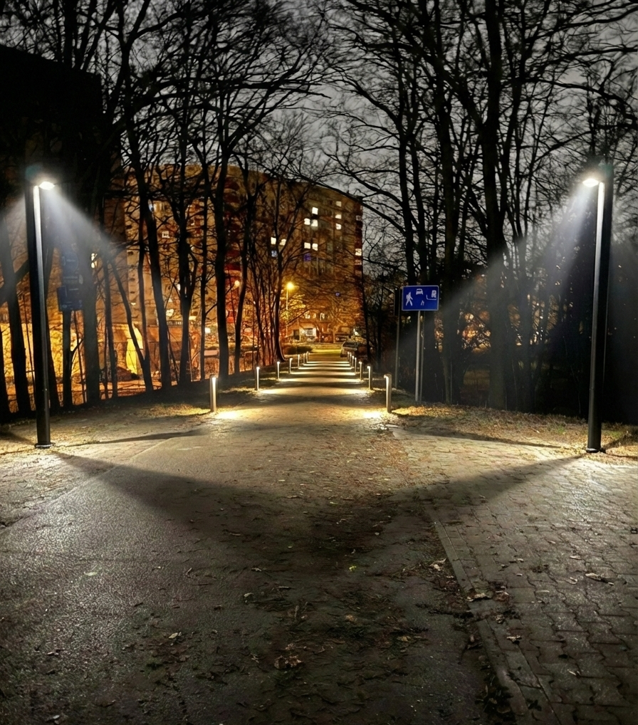 To przestrzeń idealna do rekreacji, biegania i wieczornych spacerów. Instalacja jest energooszczędna i zaprojektowana tak, by minimalizować zanieczyszczenie światłem (Dark Sky), chroniąc nocny ekosystem rzeki.