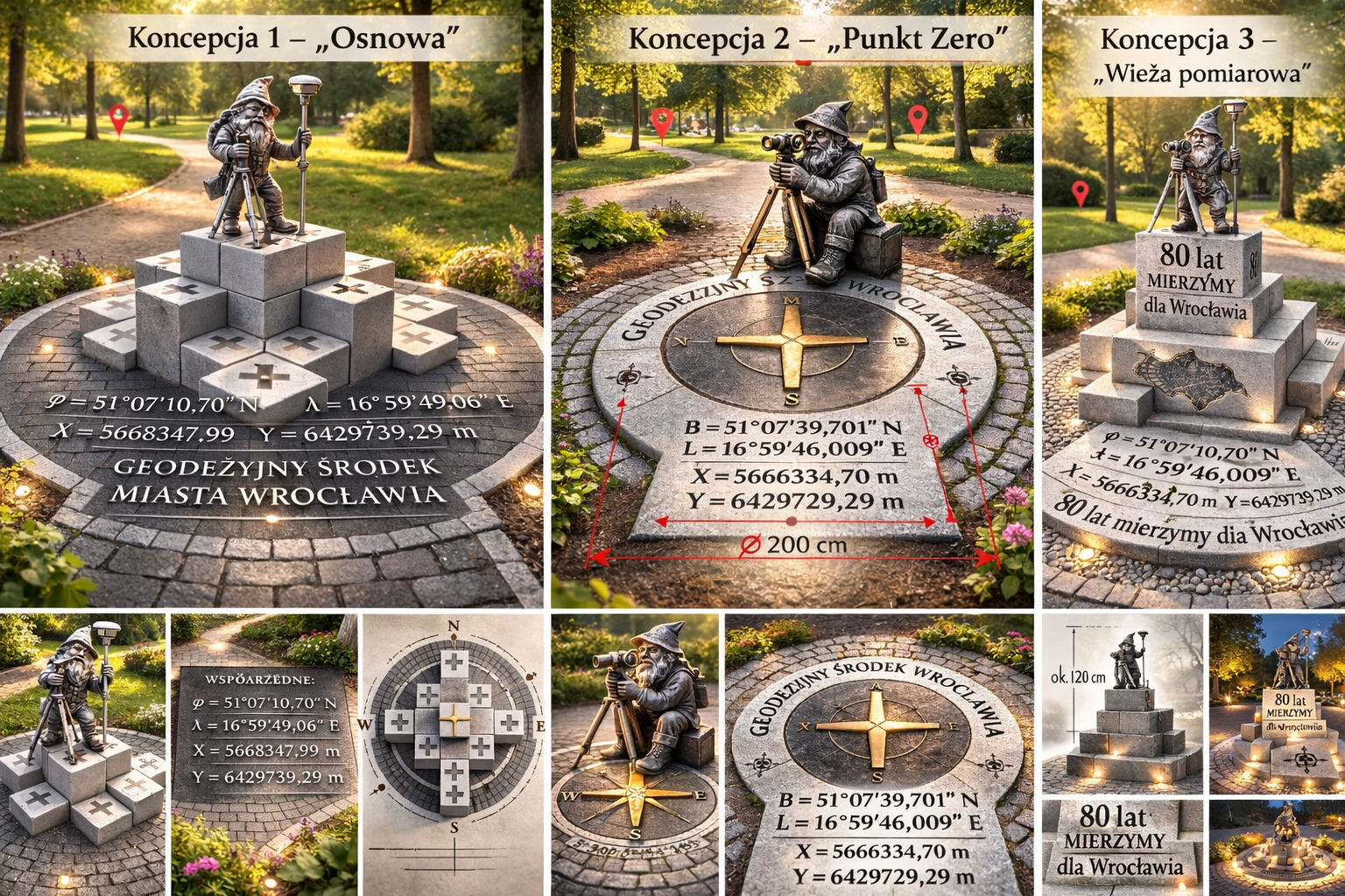 Projekt trwałego oznaczenia geodezyjnego środka miasta Wrocławia stanowi inicjatywę łączącą naukę, historię oraz lokalną tożsamość. Wyznaczenie środka geodezyjnego jest wynikiem precyzyjnych analiz matematycznych i pomiarowych - jednak bez materialnego upamiętnienia pozostaje on jedynie zapisem współrzędnych. Projekt nadaje temu miejscu realny, widoczny wymiar w przestrzeni publicznej. Upamiętnienie w formie pomnika z figurką krasnala wpisuje się w charakter miasta Wrocławia oraz jego rozpoznawalną tradycję rzeźb krasnalowych, a jednocześnie wprowadza nową wartość - edukacyjną i naukową. „Geodeta 80-latek” symbolicznie podkreśla 80-letnią działalność SGP we Wrocławiu oraz wkład środowiska geodezyjnego w rozwój miasta.