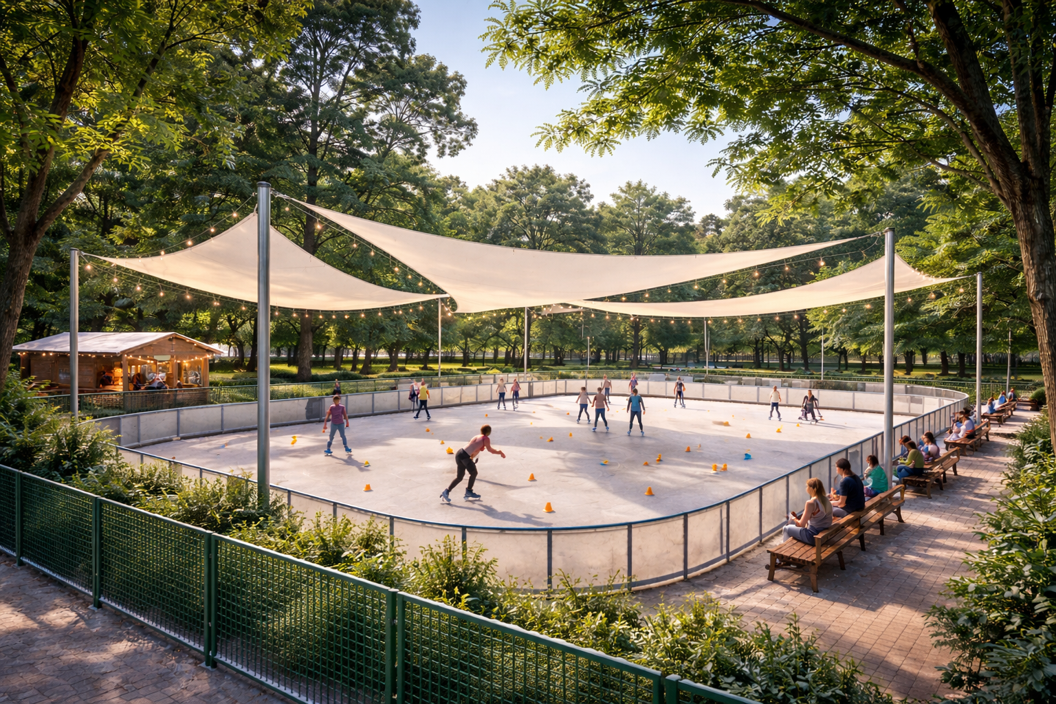 Projekt zakłada budowę wielofunkcyjnego obiektu sportowo-rekreacyjnego pełniącego funkcję wrotkowiska w sezonie wiosenno-letnim oraz lodowiska w sezonie zimowym. Planowana jest budowa płyty o wym. 20 x 40 m (z możliwością realizacji wariantu: 15 x 30 m) z nawierzchnią z gładkiego, szlifowanego betonu o podwyższonej trwałości i odpowiednich parametrach umożliwiających sezonową adaptację do funkcji lodowiska. Obiekt będzie przystosowany do: jazdy rekreacyjnej, jazdy slalomowej, gry w hokeja na rolkach oraz do funkcjonowania jako lodowisko sezonowe m.in. poprzez instalację systemu mrożenia (agregat chłodniczy z instalacją rurową) lub wariantu lodowiska naturalnego. Całość obiektu zostanie przykryta lekkim zadaszeniem w formie 2-4 żagli.