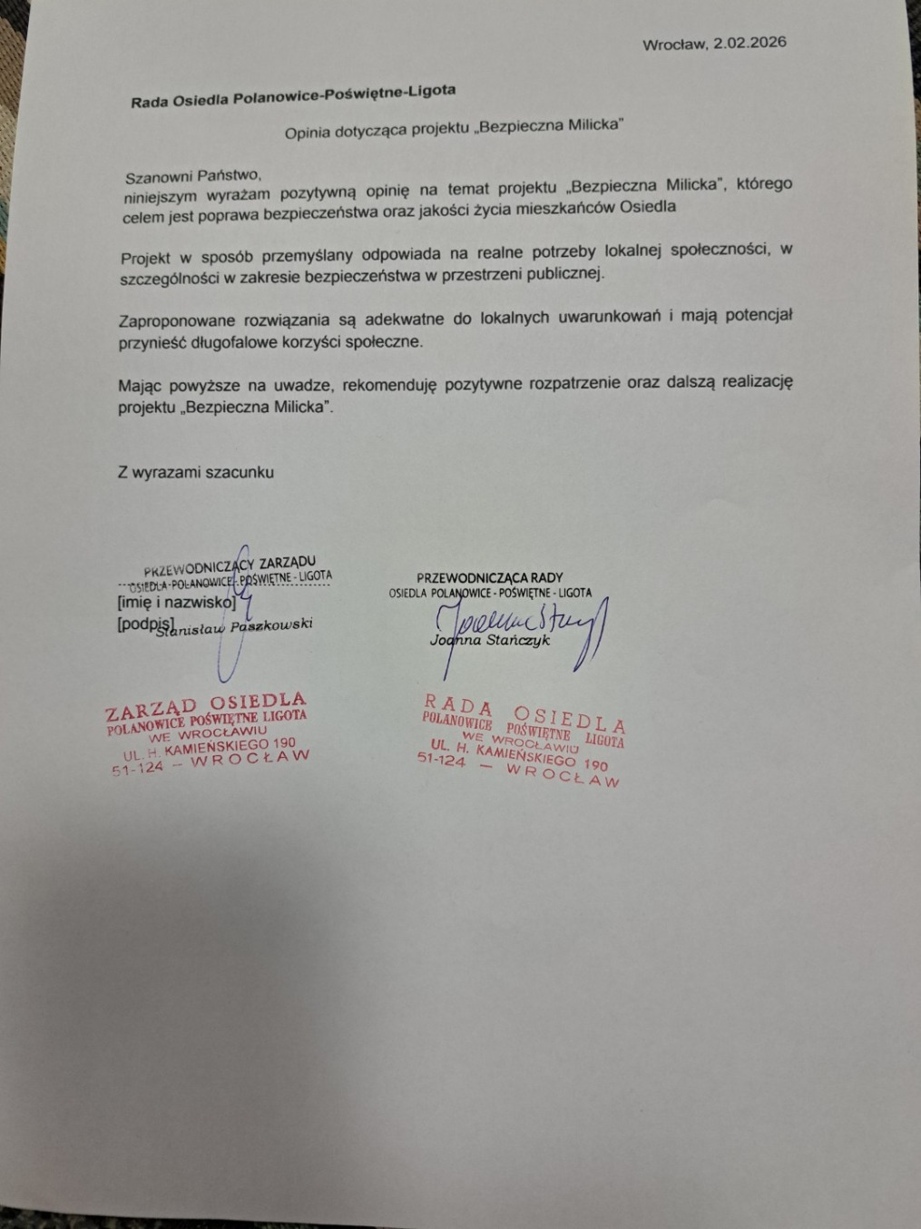 Projekt „Bezpieczna Milicka” to odpowiedź na codzienne obawy mieszkańców osiedla, którzy każdego dnia poruszają się ulicą Milicką - jedną z najważniejszych lokalnych dróg. To ulica, przy której toczy się zwykłe, osiedlowe życie: dzieci idą do żłobka i na zajęcia, rodzice z wózkami robią zakupy, seniorzy wychodzą na spacery. Projekt zakłada budowę brakującego chodnika, wykonanie odwodnienia oraz uporządkowanie parkowania, aby ulica przestała być barierą i zagrożeniem, a stała się bezpieczną i przyjazną przestrzenią dla mieszkańców. „Bezpieczna Milicka” to inwestycja w spokój, bezpieczeństwo i komfort codziennego życia na osiedlu.