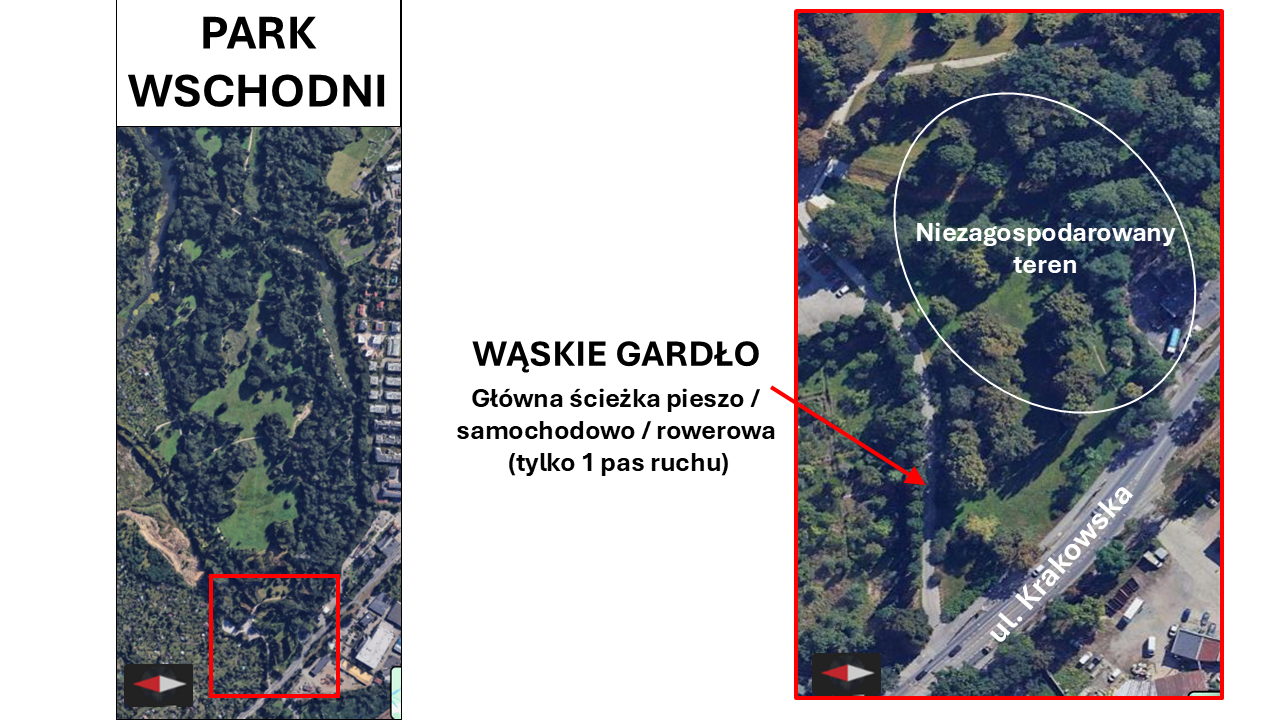 Najbardziej popularne wejście od ulicy Krakowskiej jest poprzedzone długą ścieżką, która jednocześnie jest drogą dojazdową dla aut na parking przy parku, co staje się mało komfortowe dla pieszych, rodziców z dziećmi, ludzi z psami i ogólnie wszystkich spacerujących tą drogą dojścia do parku.