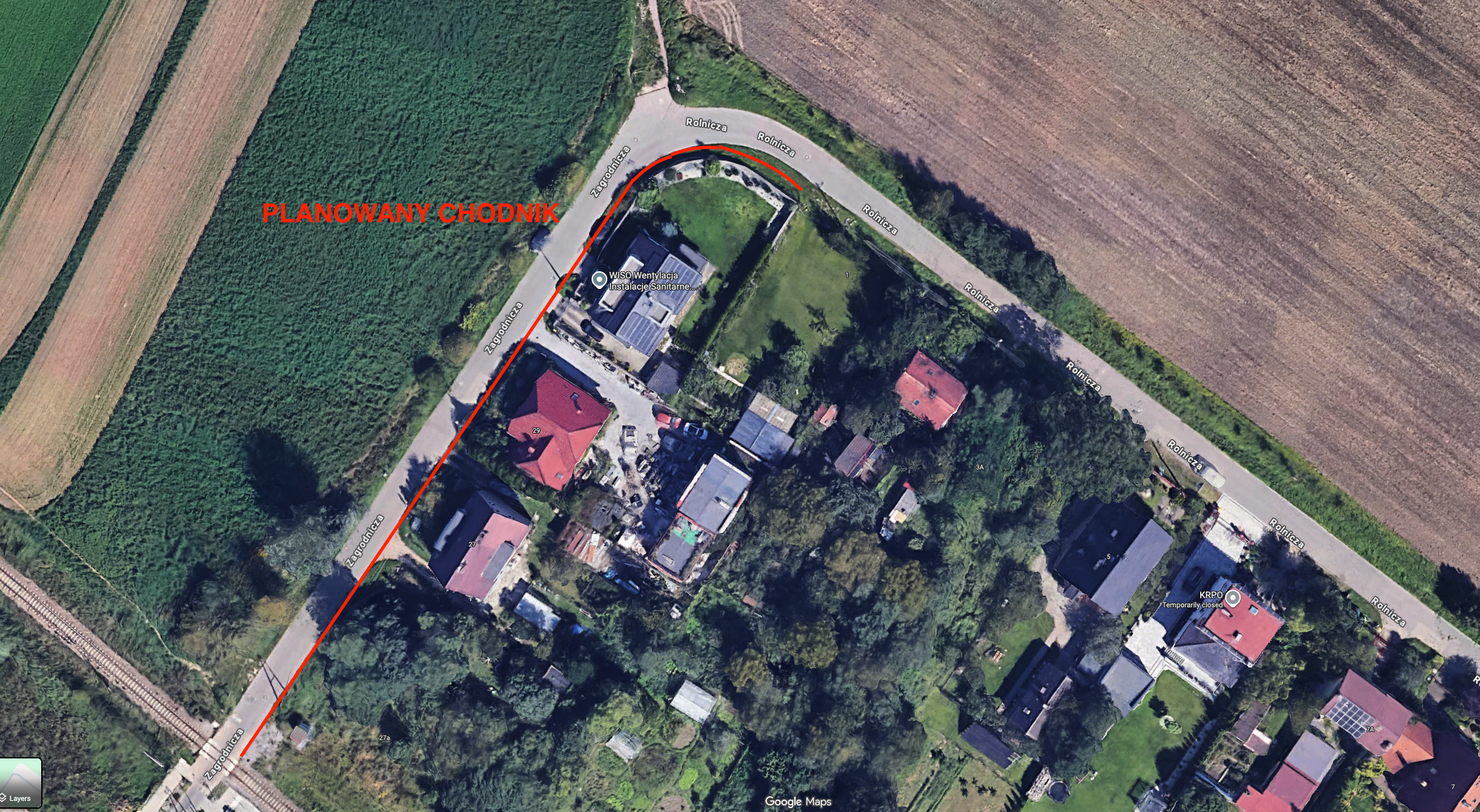 Projekt zakłada budowę chodnika o długości około 100 metrów po jednej stronie ul. Zagrodniczej we Wrocławiu, na odcinku od skrzyżowania z ul. Rolniczą w kierunku torów kolejowych.