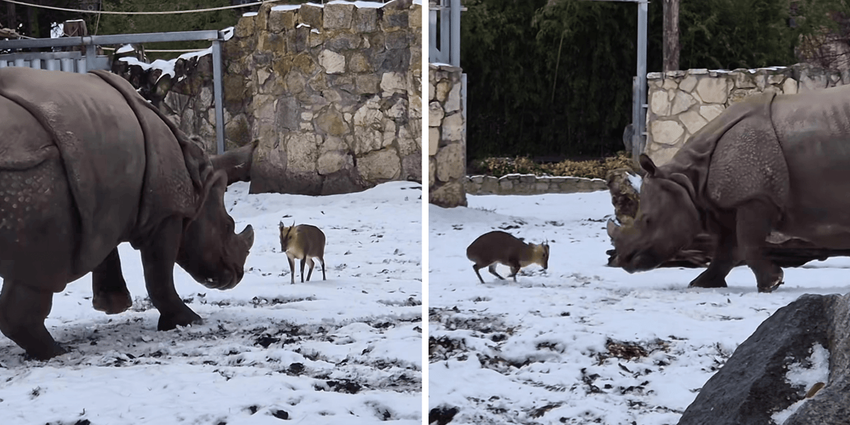 – I u nas, i w naturze, mundżaki chińskie i nosorożce mieszkają obok siebie i mają ze sobą do czynienia. W naszym zoo mieszka z nimi także rodzina gibonów czapników, która ze względu na mróz spędza czas na wybiegu wewnętrznym – wyjaśnia Maciej Okupnik, opiekun zwierząt kopytnych we wrocławskim zoo. - Mundżaki są bardzo terytorialne, oznaczają swój teren wydzieliną z gruczołów zapachowych usytuowanych wokół oczu. Z kolei nosorożce tolerują inne zwierzęta na swoim terenie, bo oprócz tygrysów nikogo się nie boją. Na ogół mundżaki i nosorożce nie wchodzą sobie w drogę. Tym razem naszego samczyka – nazywamy go Tatą – poniosły nieco hormony, ale tak naprawdę nie ryzykował. To bardziej teatr i widać, że nasza Maruśka trochę się tym wszystkim bawi.