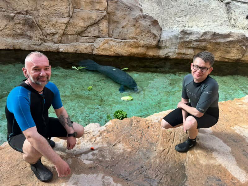 Ambroży bardzo dobrze trafił: nowy pawilon, duże zbiorniki, świetni opiekunowie, a wśród nich bardzo doświadczona w pracy ze ssakami morskimi brygadzistka Myriam, niesamowicie łebska dziewczyna. Nasz manat nie jest w nowym miejscu sam: w tym samym zbiorniku przebywa już Quango, samiec, który przybył tam tydzień wcześniej z ogrodu Beauval.Marcin Matuszak, brygadzista sekcji zwierząt kopytnych