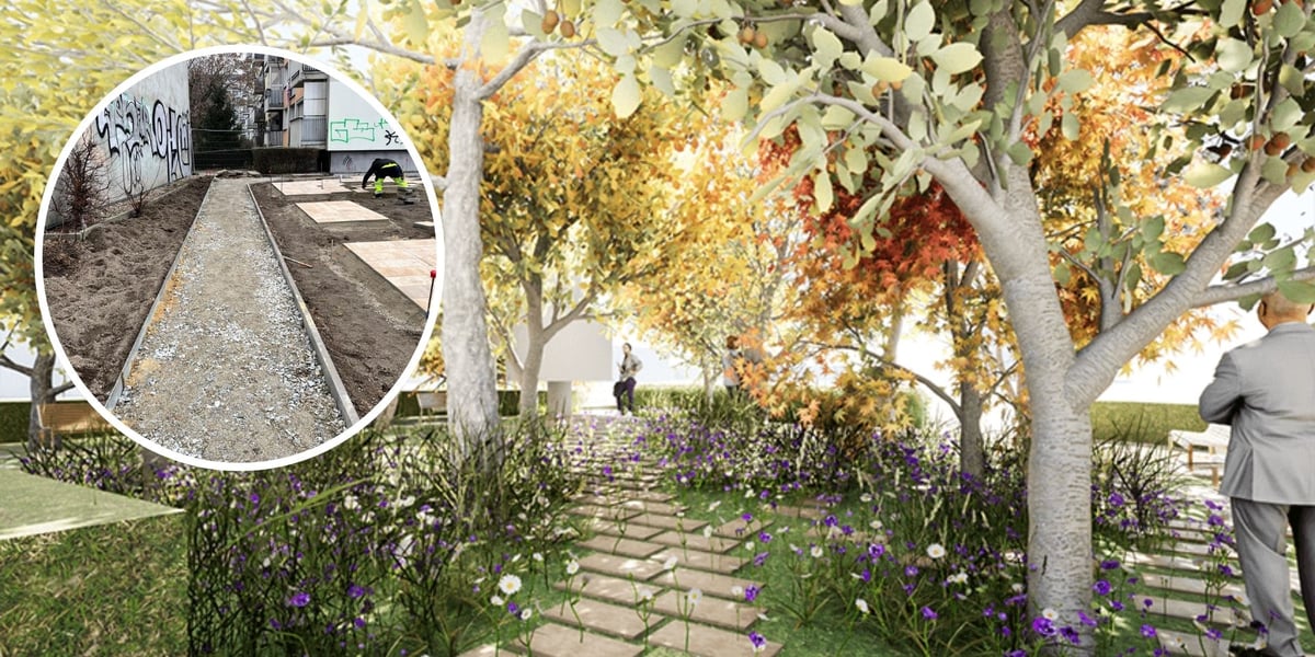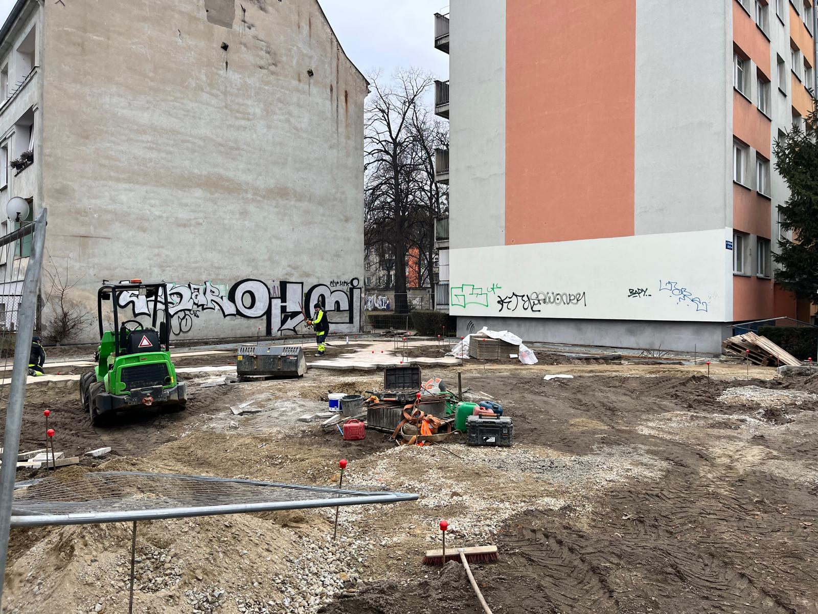 Prace ruszyły w tym roku, a pierwsze efekty są już widoczne. Wykonawca przygotował podłoże i zaczął układać kamienne płyty, które utworzą ścieżki między miejscami przeznaczonymi na nasadzenia.