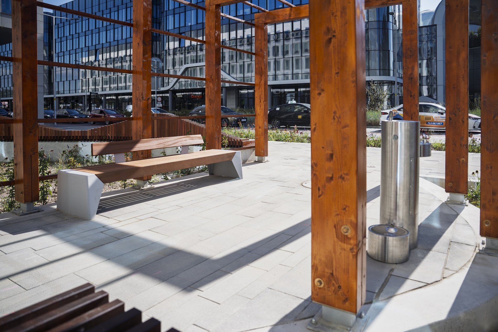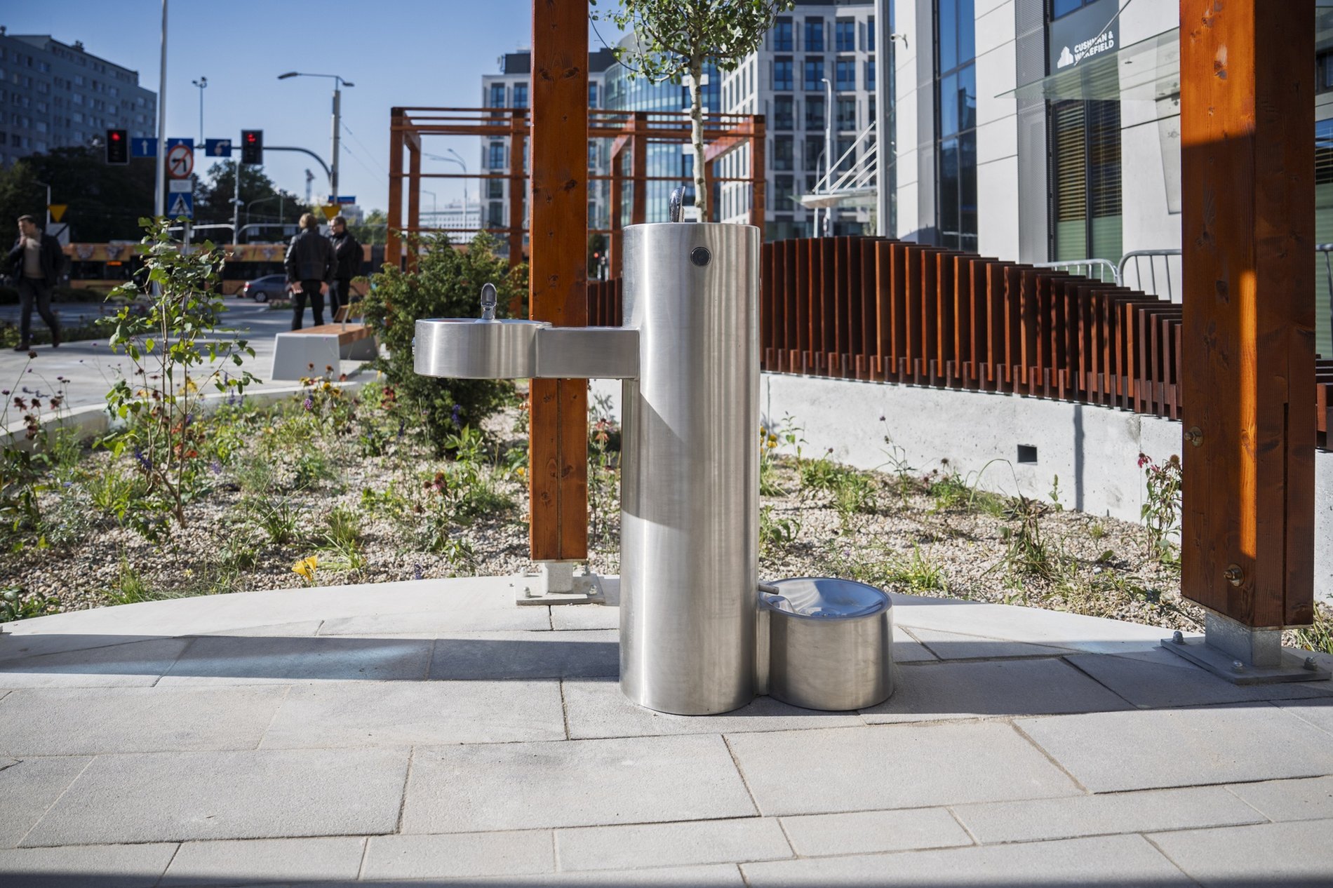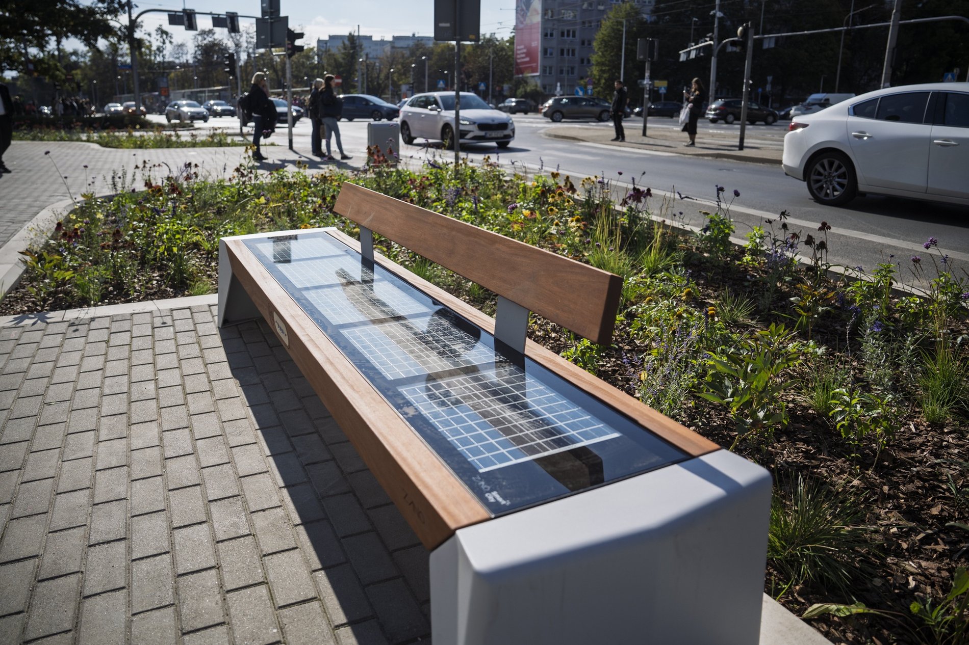 Teraz grunt zajęty przez rośliny zajmuje na ul. Suchej prawie 360 mkw. Latem poprawi się tu mikroklimat - będzie można usiąść i odpocząć. Postawiono też pergolę i zdrój z wodą pitną oraz ławki, w tym jedną z baterią słoneczną. Posłuży ona także jako źródło energii dla chcących np. naładować telefon.