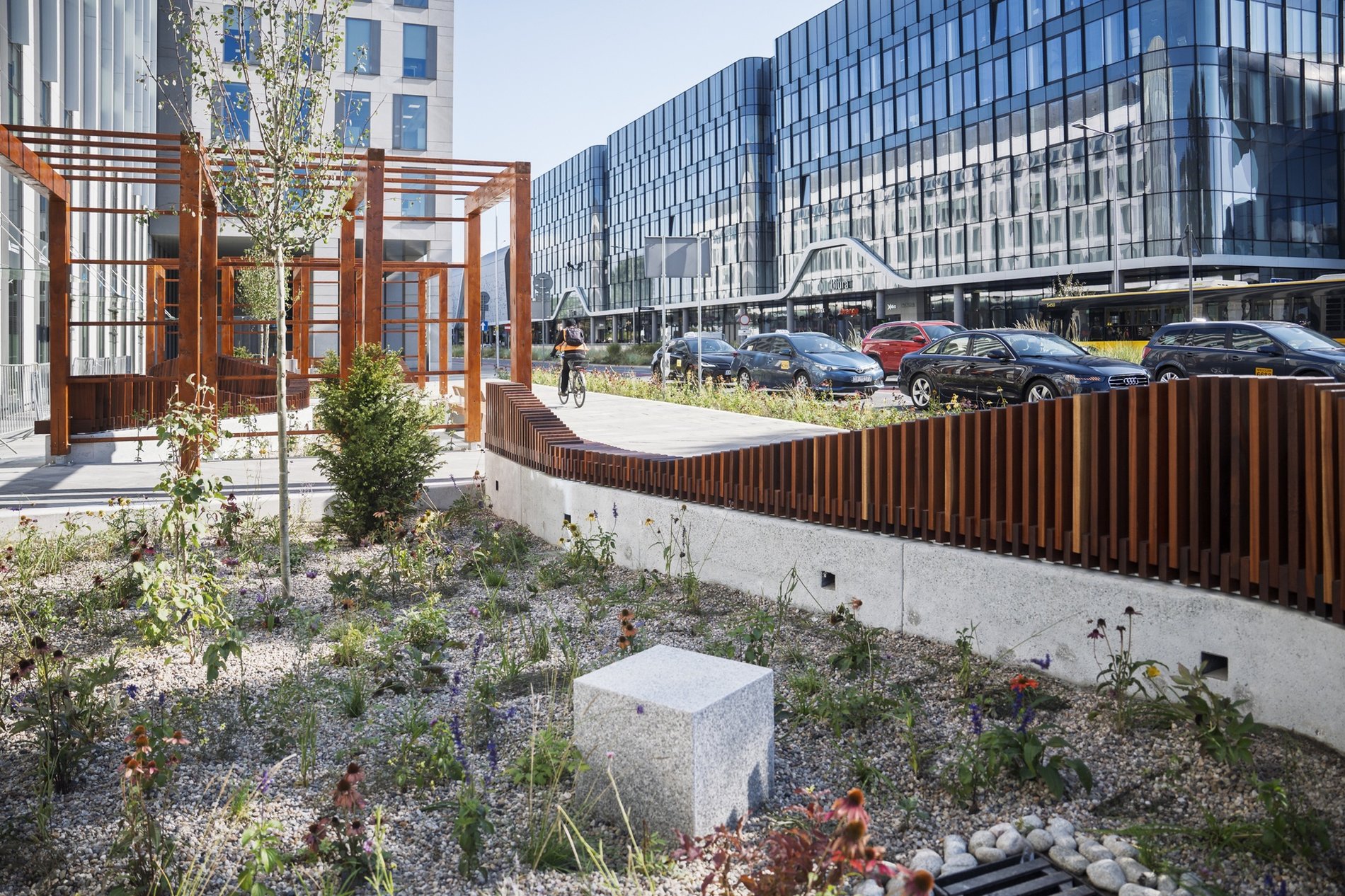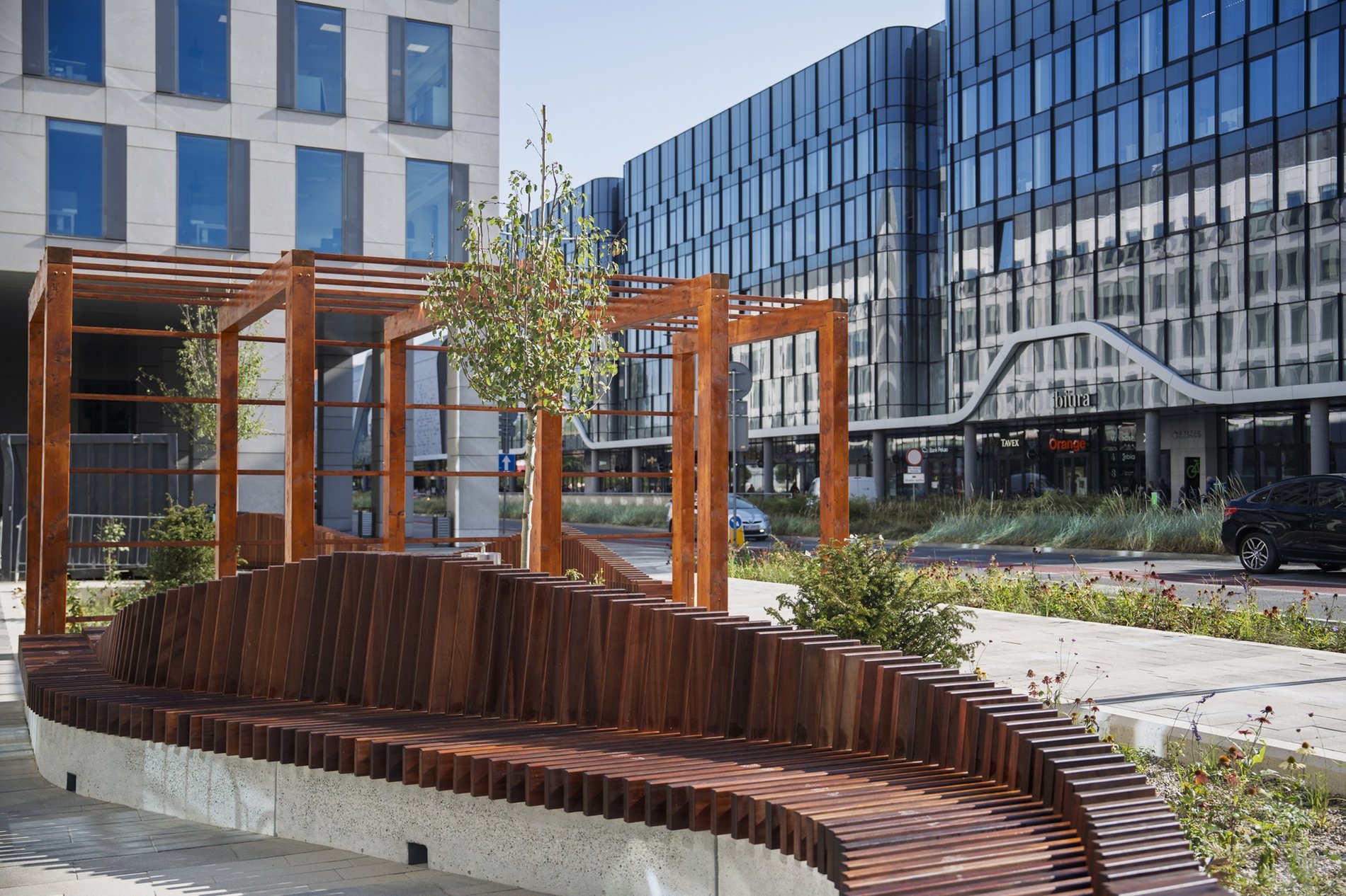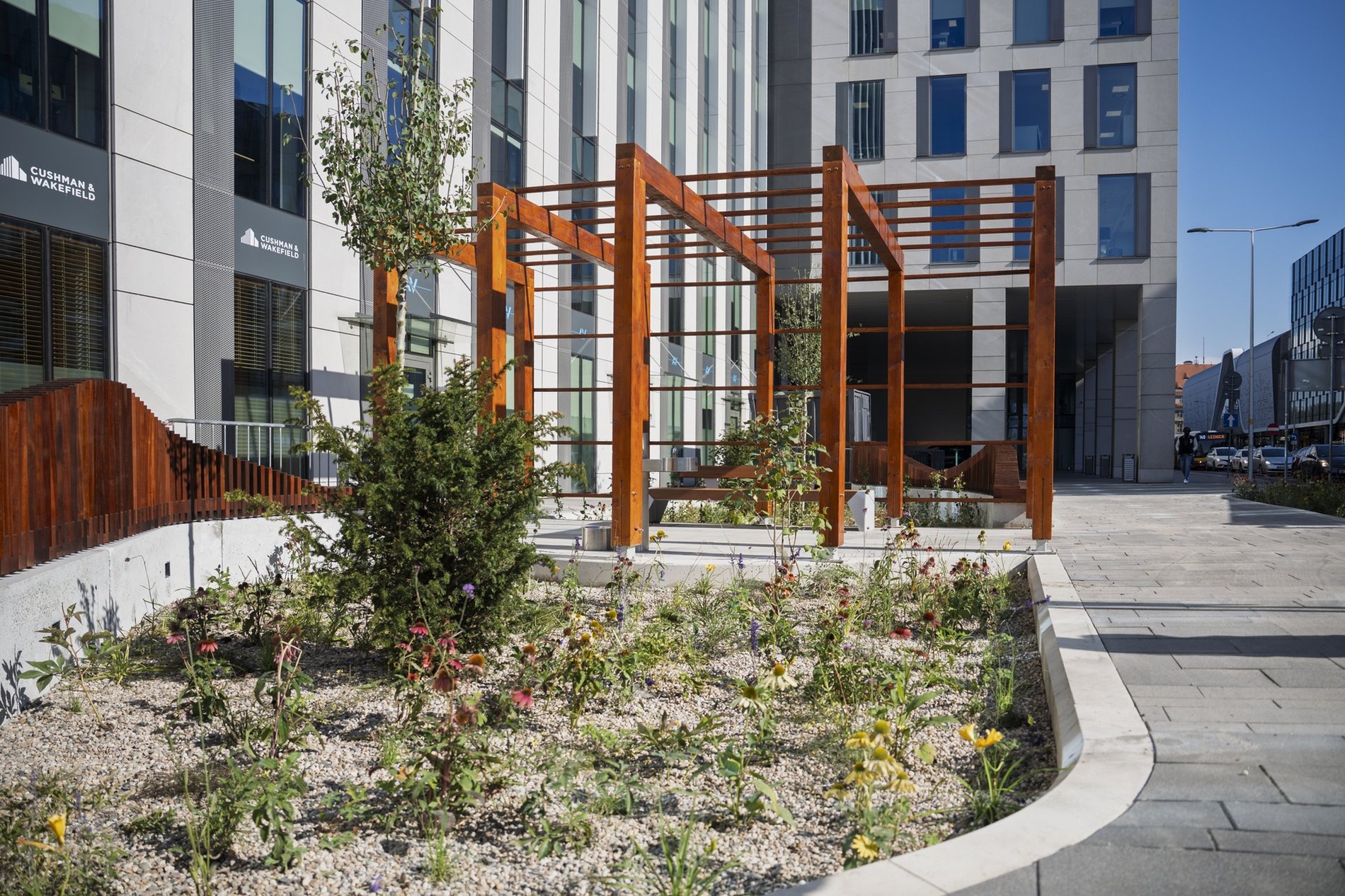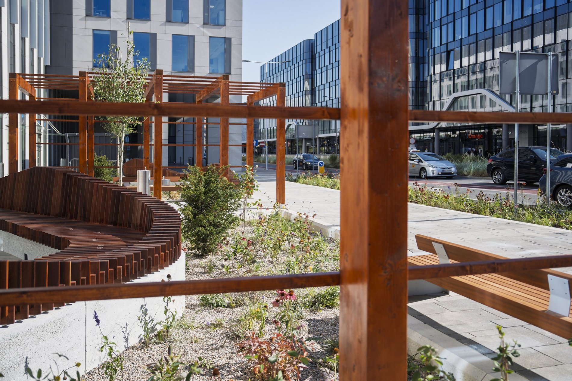 Teraz grunt zajęty przez rośliny zajmuje na ul. Suchej prawie 360 mkw. Latem poprawi się tu mikroklimat - będzie można usiąść i odpocząć. Postawiono też pergolę i zdrój z wodą pitną oraz ławki, w tym jedną z baterią słoneczną. Posłuży ona także jako źródło energii dla chcących np. naładować telefon.
