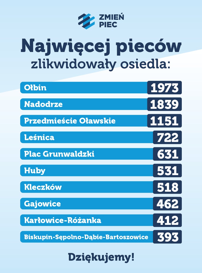 Lista „rekordowych” osiedli i ulic nie dziwi, ponieważ jest zgodna z wynikami badań, dotyczącymi zagęszczenia źródeł ciepła na paliwa stałe na terenie Wrocławia. Cieszy fakt, że wymianą pieców tak aktywnie zainteresowali się mieszkańcy kamienic, wpływając pozytywnie na komfort życia swój i swoich sąsiadów oraz znacznie poprawiając bezpieczeństwo budynków, w których żyją. Gratulujemy tym osiedlom i ulicom, które znalazły się na najwyższych miejscach i zachęcamy resztę do jeszcze aktywniejszych działań w zakresie wymiany ogrzewania.Katarzyna Szymczak-Pomianowska, dyrektor Departamentu Zrównoważonego Rozwoju UMW
