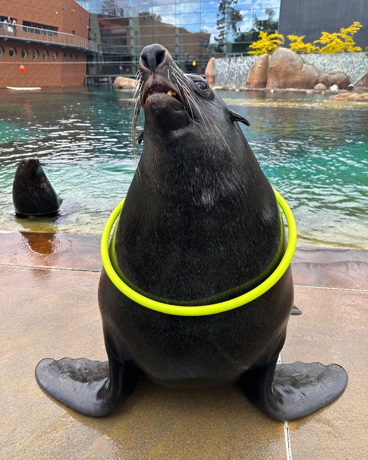 To jednak nie wszystko, bo na wybiegu zewnętrznym (to część ekspozycji wybrzeża Namibii) mają mnóstwo zabawek, m.in. piłki, hula hop, a nawet deskę surfingową, na którą lubią się wdrapywać i której spodnia strona zdaje się bardzo interesująca. Poza stałym wyposażeniem, pojawiają się też nowości.