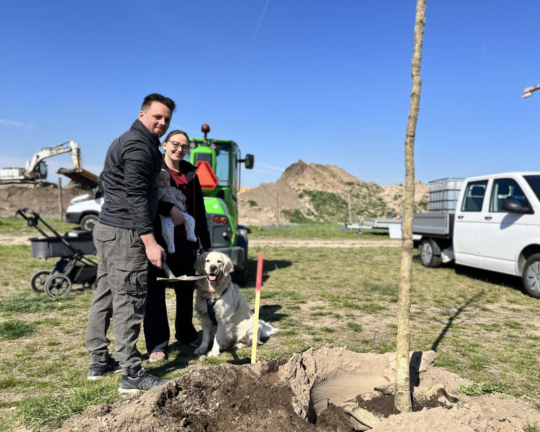 Dla urodzonej w tym roku Igi drzewo sadzi cała rodzina: Nina, Kacper i pies Racuch.
