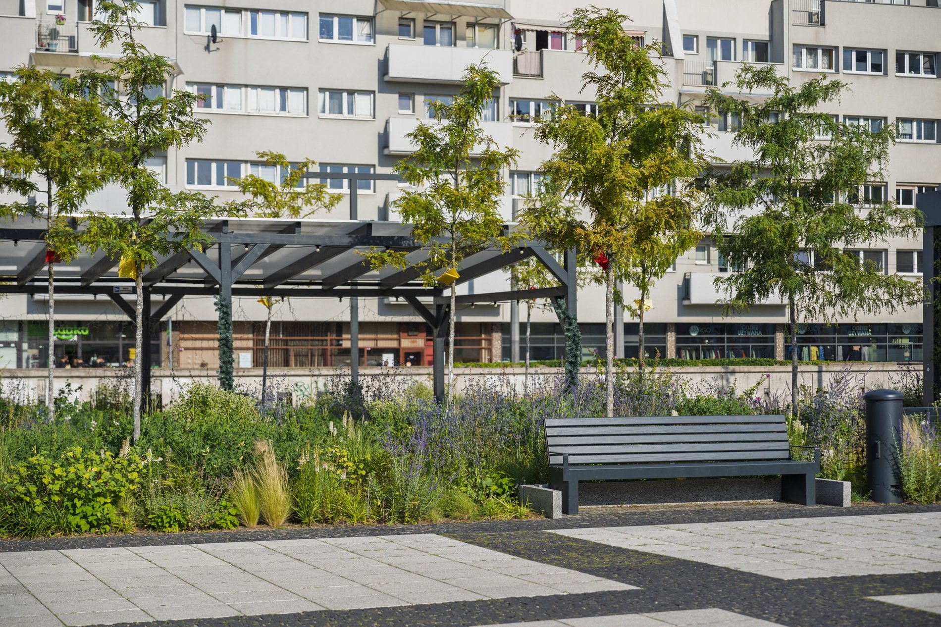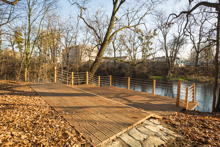Do tego zainstalowano szereg elementów małej architektury: ławki, kosze na śmieci, leżaki parkowe, stojaki na rowery. Nasadzono też wiele bylin, krzewów i założono trawniki.