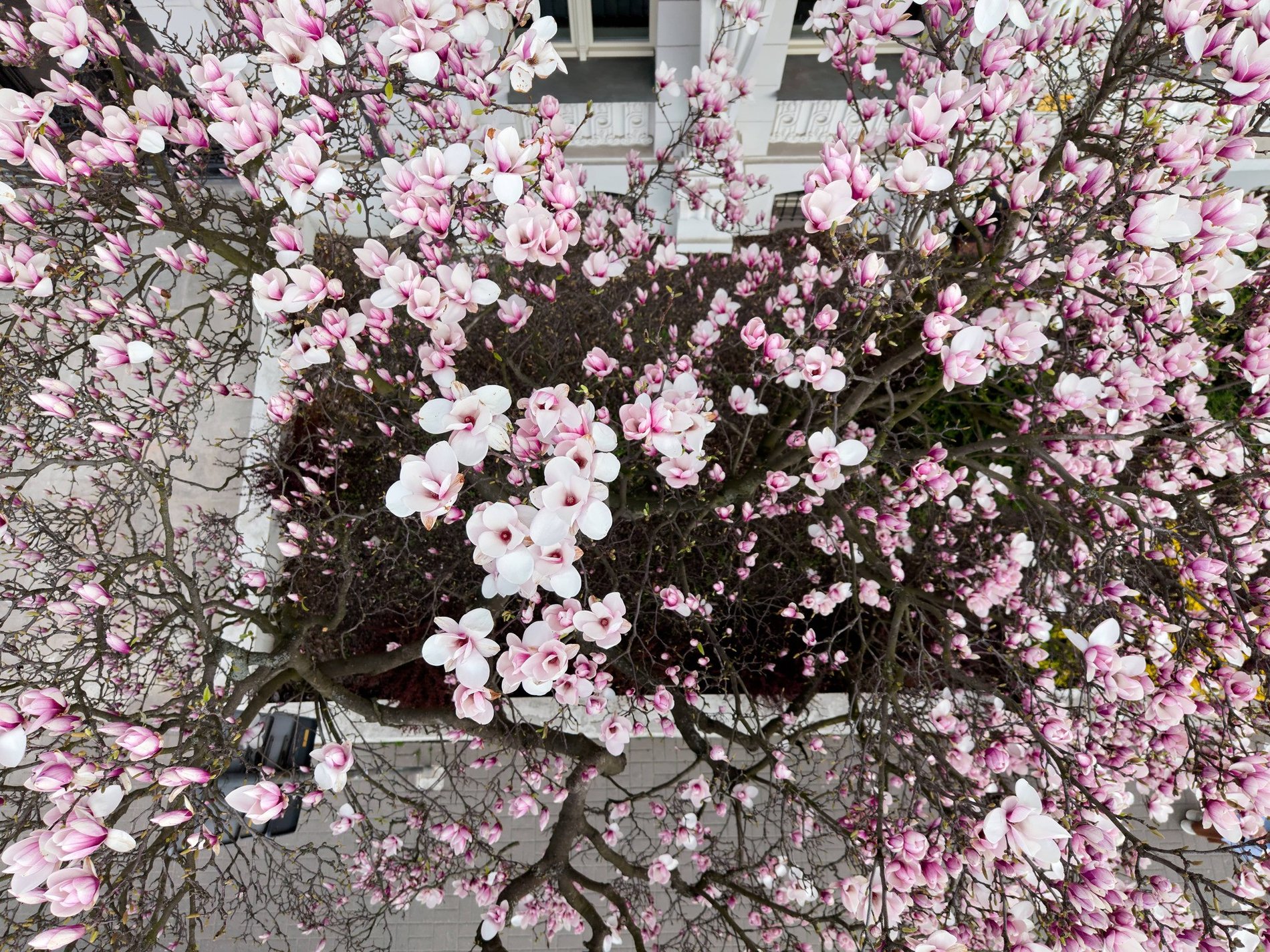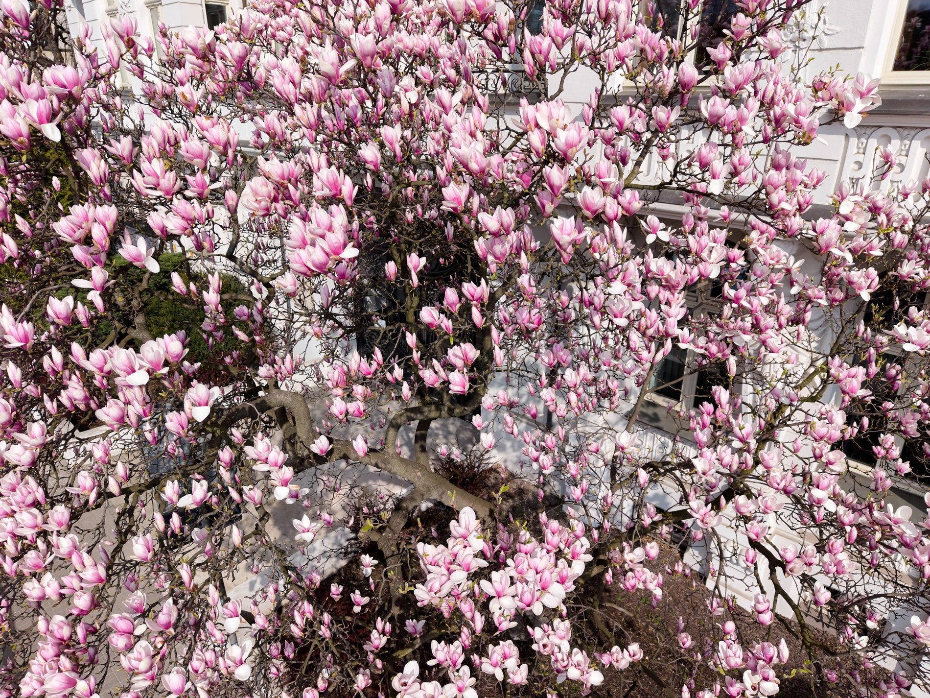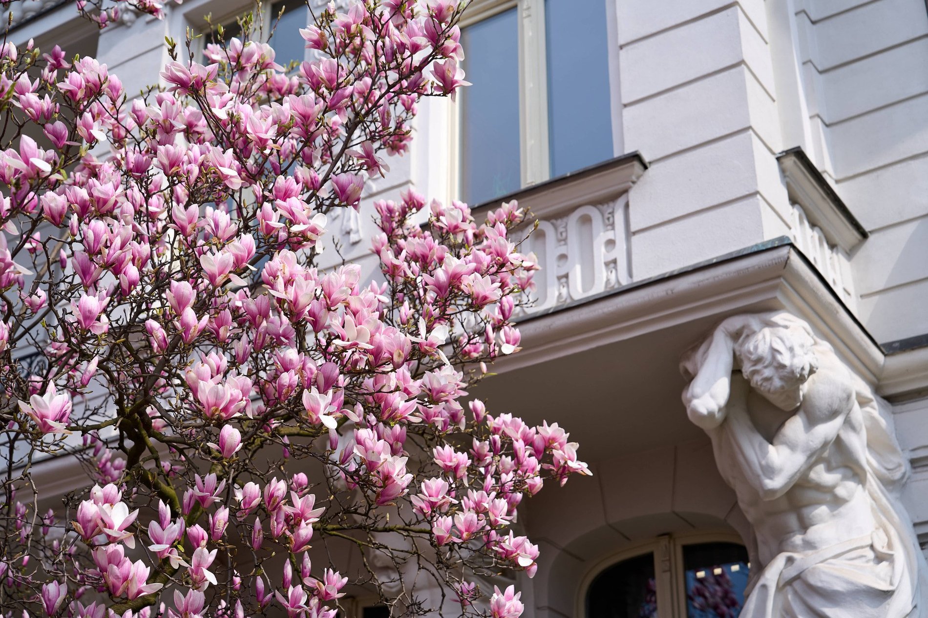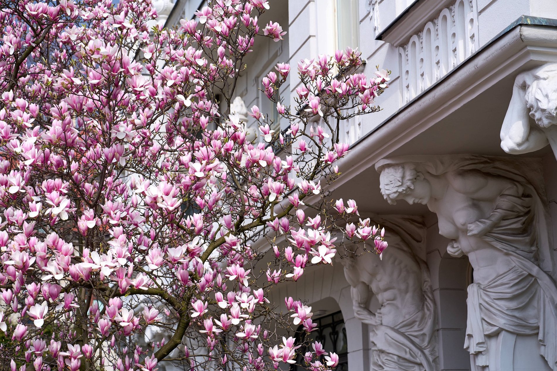 Podobnie jak w poprzednich latach, również i tej wiosny magnolia przy Podwalu robi wrażenie. Duże białoróżowe kwiaty pokrywają cało drzewo rosnące od frontu bogato zdobionej kamienicy.