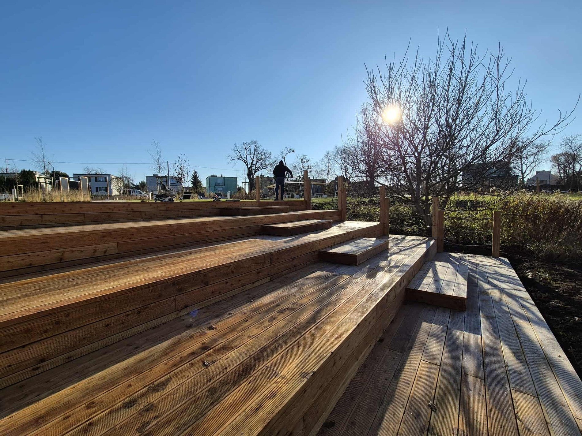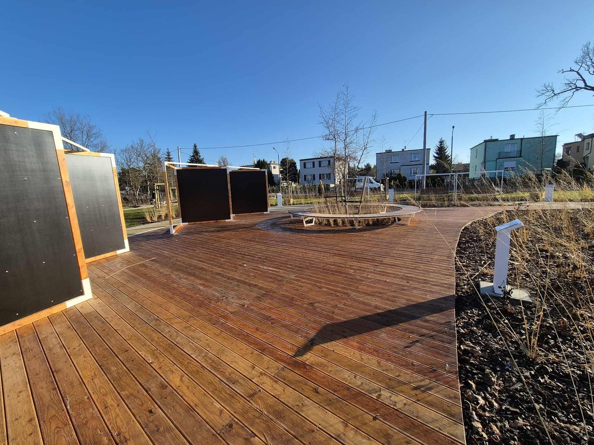 Oprócz tego cześć terenu została zabudowana tarasowymi schodami i drewnianym podestem, na którym ustawiono tablice ekspozycyjno-informacyjne. W parku jest też przewidziane miejsce, gdzie w przyszłości stanie biblioteczny książkomat. Całości dopełnia strefa dla dzieci z huśtawkami.